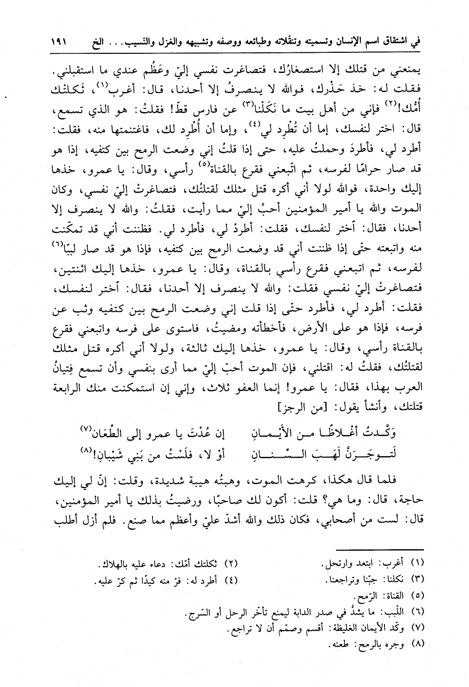 يمنعني من قتلك إلا استصغارك ، فتصاغرت نفسي إليّ وعظُم عندي ما استقبلني . فقلت له : خذ حذرك ، فو الله لا ينصرف إلا أحدنا ، قال : أغرب ، ثكلتك أمُّك فإني من أهل بيت ما نكلنا عن فارس قط فقلت : هو الذي تسمع ، قال : اختر لنفسك ، إما أن تطرد لي ، وإما أن أطرد لك ، فاغتنمتها منه ، فقلت : أطرد لي ، فأطرد وحملت عليه ، حتى إذا قلت إني وضعت الرمح بين كتفيه ، إذ هو قد صار حزاماً لفرسه ، ثم اتبعني فقرع بالقناة رأسي ، وقال : يا عمرو ، خذها إليك واحدة ، فوالله لولا أني أكره قتل مثلك لقتلتك ، فتصاغرت إليّ نفسي ، وكان الموت والله يا أمير المؤمنين أحبَّ إليّ مما رأيت ، فقلت : والله لا ينصرف إلا أحدنا ، فقال : اختر لنفسك ، فقلت : أطرد لي ، فأطرد لي . فظننت أني قد تمكنت منه واتبعته حتى إذا ظننت أني قد وضعت الرمح بين كتفيه ، فإذا هو قد صار لبياً لفرسه ، ثم اتبعني فقرع رأسي بالقناة وقال : يا عمرو ، خذها إليك اثنتين ، فتصاغرت إليّ نفسي فقلت : والله لا ينصرف إلا أحدنا ، فقال : اختر لنفسك ، فقلت : أطرد لي ، فأطرد حتى إذا قلت إني وضعت الرمح بين كتفيه وثب عن فرسه فإذا هو على الأرض ، فأخطأته ومضيت ، فاستوى على فرسه واتبعني فقرع بالقناة رأسي وقال : يا عمرو ، خذها إليك ثالثة ، ولولا أني قتل مثلك لقتلتك ، فقلت له : اقتلني ، فإن الموت أحب إليّ مما أرى بنفسي وأن تسمع فتيان العرب بهذا ، فقال : يا عمرو إنما العفو ثلاث ، وإني إن استمكنت منك الرابعة قتلتك ، وأنشأ يقول :