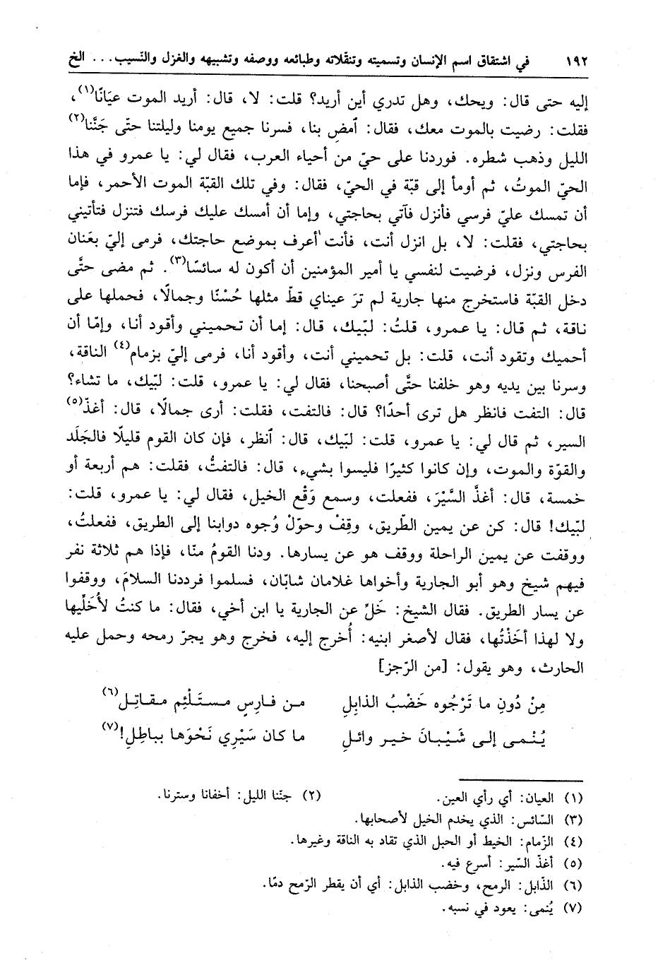إليه حتى قال : ويحك ، وهل تدري أين أريد ؟ قلت : لا ، قال : أريد الموت عياناً ، فقلت : رضيت بالموت معك ، فقال : امضي بنا ، فسرنا جميع يومنا وليلتنا حتى جننَّا الليل وذهب شطره . فوردنا على حيٍّ من أحياء العرب ، فقال لي : يا عمرو في هذا الحيِّ الموت ، ثم أومأ إلى قبةٍ في الحيِّ فقال : وفي تلك القبة الموت الأحمر ، فإما أن تمسك عليّ فرسي فأنزل فأتي بحاجتي ، وإما أن أمسك عليك فرسك فتنزل فتأتيني بحاجتي ، فقلت : لا ، بل انزل أنت ، فأنت أعرف بموضع حاجتك ، فرمى إليّ بعنان الفرس ونزل ، فرضيت لنفسي يا أمير المؤمنين أن أكون له ساساً . ثم مضى حتى دخل العقبة فاستخرج منها جاريةً لم تر عيناي قط مثلها حسناً وجمالاً ، فحملها على ناقة ، ثم قال : يا عمرو ، قلت : لبيك ، قال : إما أن تحميني وأقود أنا ، وإما أن أحميك وتقود أنت ، قلت : بل تحميني أنت ، وأقود أنا ، فرمى إليّ بزمام الناقة ، وسرنا بين يديه وهو خلفنا حتى أصبحنا ، فقال لي : يا عمرو ، قلت : لبيك ، ما تشاء ؟ قال : التفت فانظر هل ترى أحداً ؟ قال : فالتفت ، فقلت : أرى جمالاً ، قال : أغذّ السير ، ثم قال لي : يا عمرو ، قلت : لبيك ، قال : انظر ، فإن كان القوم قليلاً فالجلد والقوة والموت ، وإن كانوا كثيراً فليسوا بشيء ، قال : فالتفتُّ ، فقلت : هم أربعة أو خمسة ، قال : أغذَّ السير ، ففعلت ، وسمع وقع الخيل ، فقال لي : يا عمرو ، قلت : لبيك قال : كن عن يمين الطريق ، وقف وحوّل وجوه دوابنا إلى الطريق ، ففعلت ، ووقفت عن يمين الراحلة ووقف هو عن يسارها . ودنا القوم منا ، فإذا هم ثلاثة نفر فيهم شيخ وهو أبو الجارية وأخواها غلامان شابان ، فسلموا فرددنا السلام ، ووقفوا عن يسار الطريق . فقال الشيخ : خلِّ عن الجارية يا ابن أخي ، فقال : ما كنت لأخليها ولا لهذا أخذتها ، فقال لأصغر ابنيه : اخرج إليه ، فخرج وهو يجرّ رمحه وحمل عليه الحارث وهو يقول :