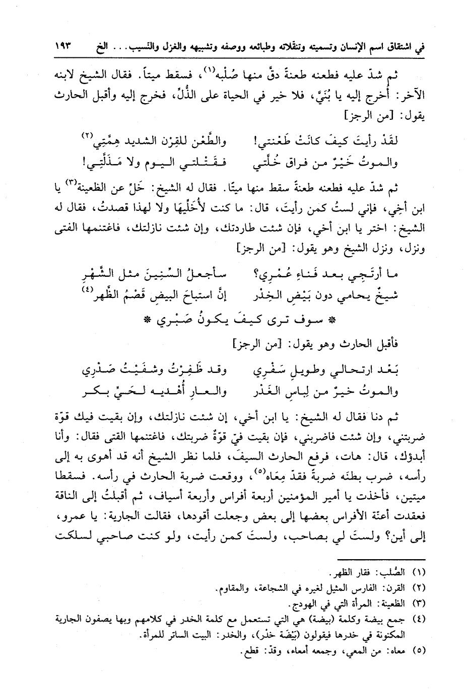 ثم شدّ عليه فطعنه طعنةً سقط منها ميتاً . فقال له الشيخ : خلِّ عن الظعينة يا ابن أخي ، فإني لست كمن رأيت ، قال : ما كنت لأخلِّيها ولا هذا قصدت ، فقال له الشيخ : اختر يا ابن أخي ، فإن شئت طاردتك ، وإن شئت نازلتك ، فاغتنمها الفتى ونزل . ونزل الشيخ وهو يقول :