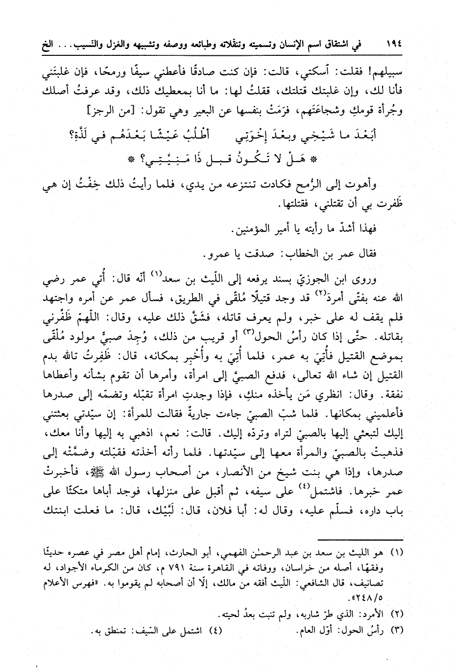 سبيلهم فقلت : اسكتي ، قالت : فإن كنت صادقاً فأعطني سيفاً ورمحاً ، فإن غلبتني فأنا لك ، وإن غلبتك قتلتك ، فقلت لها : ما أنا بمعطيك ذلك ، وقد عرفت أصلك وجُرأة قومك وشجاعتهم ، فرمت بنفسها عن البعير وهي تقول :