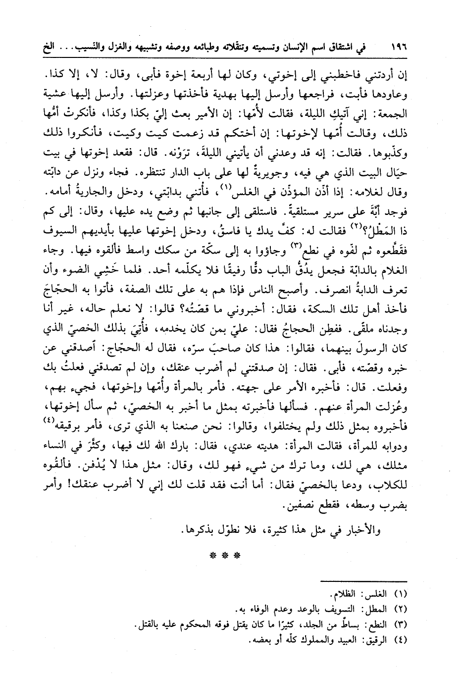 إن أردتني فاخطبني إلى اخوتي ، وكان لها أربعة اخوة فأبى ، وقال : لا ، إلا كذا . وعاودها فأبت ، فراجعها وأرسل إليها بهدية فأخذتها وعزلتها . وأرسل إليها عشية الجمعة : إني آتيك الليلة ، فقالت لأمها : إن الأمير بعث إليّ بكذا وكذا . فأنكرت أمُّها ذلك ، وقالت أمها لاخوتها إن أختكم قد زعمت كيت وكيت : فأنكروا ذلك وكذبوها . فقالت إنه قد وعدني أن يأتيني الليلة ، لترونه . قال : فقعد اخوتها في بيت حيال البيت الذي هي فيه ، وجويريةٌ لها على باب الدار تنتظره . فجاء ونزل عن دابته وقال لغلامه : إذا أذن المؤذن في الغلس ، فأتني بدابتي ، ودخل والجارية أمامه . فوجد أبَّة على سرير مستلقيةً . فاستلقى إلى جانبها ثم وضع يده عليها ، وقال : إلى كم ذا المطل ؟ فقالت له : كف يدك يا فاسق ، ودخل اخوتها عليه بأيديهم السيوف فقطَّعوه ثم لفوه في نطع وجاءوا به إلى سكة من سكك واسط فألقوه فيها . وجاء الغلام بالدابة فجعل يدُقُّ الباب دقّاً رفيقاً فلا يكلمه أحد . فلما خشي الضوء وأن تعرف الدابة انصرف . وأصبح الناس فإذا هم به على تلك الصفة . فأتوا به الحجاج فأخذ أهل تلك السكة ، فقال أخبروني : ما قصته ؟ قالوا : لا نعلم حاله ، غير أنا وجدناه ملقىً . ففطن الحجاج فقال : عليّ بمن كان يخدمه ، فأُتي بذلك الخصيّ الذي كان الرسول بينهما ، فقالوا : هذا كان صاحب سره ، فقال له الحجاج : اصدقني عن خبره وقصته ، فأبى . فقال : إن صدقتني لم أضرب عنقك ، وإن لم تصدقني فعلت بك وفعلت . قال : فأخبره الأمر على جهته . فأمر بالمرأة وأُمها واخوتها ، فجيء بهم ، وعُزلت المرأة عنهم . فسألها فأخبرته بمثل ما أخبر به الخصيّ ، ثم سأل اخوتها ، فأخبروه بمثل ذلك ولم يختلفوا ، وقالوا : نحن صنعنا به الذي ترى ، فأمر برقيقه ودوابه للمرأة ، فقالت المرأة هديته عندي ، فقال : بارك الله لك فيها ، وكثَّر في النساء مثلك ، وهي لك ، وما ترك من شيء فهو لك ، وقال : مثل هذا لا يدفن . فألقوه للكلاب ، ودعا بالخصيّ فقال : أما أنت فقد قلت لك إني لا أضرب عنقك وأمر بضرب وسطه ، فقطع نصفين .