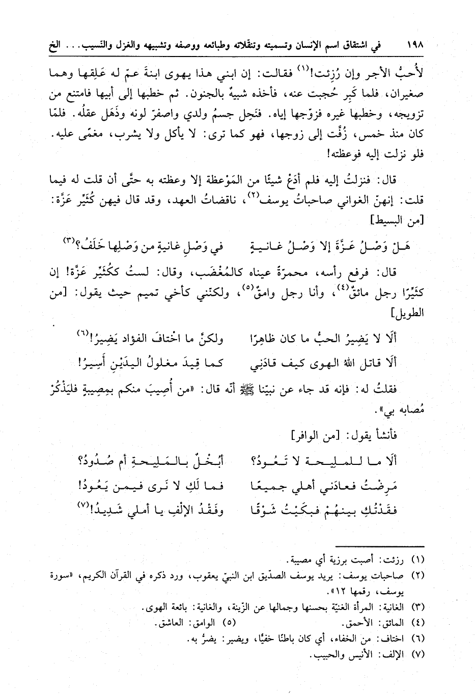 لأحب الأجر وإن رزئت فقالت : إنة ابني هذا يهوى ابنة عم له علقها وهما صغيران ، فلما كبر حجبت عنه ، فأخذه شبيه بالجنون ، ثم خطبها إلى أبيها فامتنع من تزويجه ، وخطبها غيره فزوجها إياه ، فنحل جسم ولدي واصفر لونه وذهل عقله ، فلما كان منذ خمس ، زفت إلى زوجها ، فهو كما ترى : لا يأكل ولا يشرب ، مغمى عليه فلو نزلت إليه فوعظته قال : فنزلت إليه فلم أدع شيئاً من الموعظة إلا وعظته به حتى أن قلتله فيما قلت : إنهنّ الغواني صاحبات يوسف ، ناقضات العهد ، وقد قال فيهن كثير عزَّة :