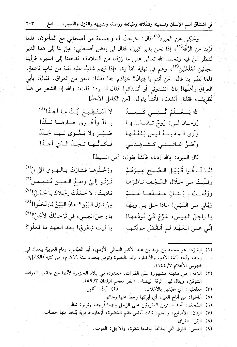 وحكي عن المبرد قال : خرجت أنا وجماعة من أصحابي مع المأمون . فلما قربنا من الرَّقَّة ، إذا نحن بدير كبير ، فقال لي بعض أصحابي : مل بنا إلى هذا الدير لننظر من فيه ونحمد الله تعالى على ما رزقنا من السلامة ، فدخلنا إلى الدير ، فرأينا مجانين مغلغلين ، وهم في نهاية القذارة ، فإذا فيهم شابٌ عليه بقية من ثيابٍ ناعمةٍ ، فلما بصر بنا قال : من أنتم يا فتيان ؟ حياكم الله فقلنا : نحن من العراق . فقال : بأبي العراق وأهلها بالله أنشدوني أو أنشدكم فقال المبرد : قلت : والله إن الشعر من هذا لظريف ، فقلنا : أنشدنا ، فأنشأ يقول :