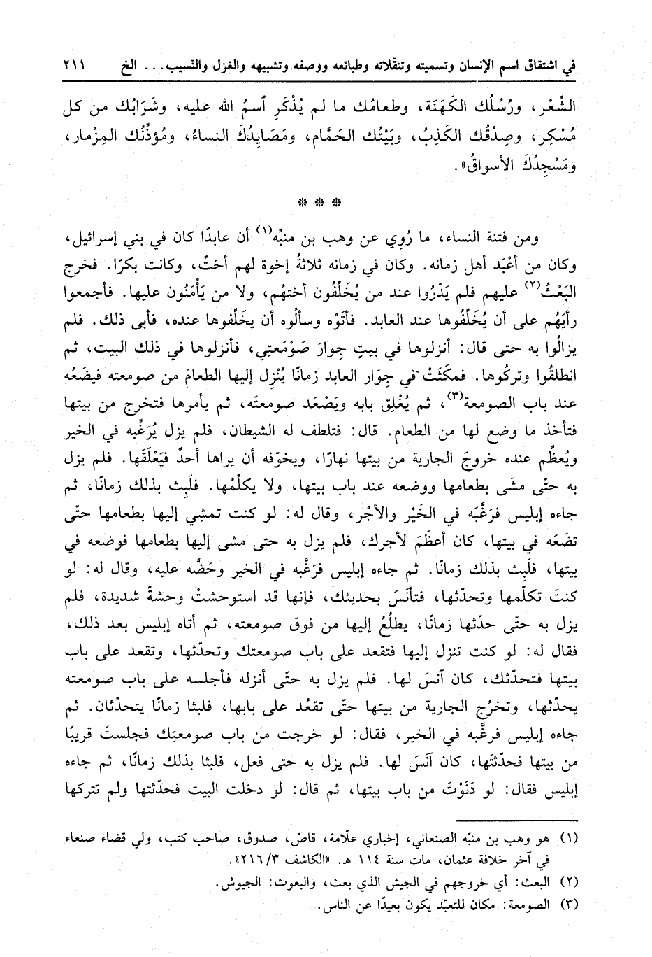 الشِّعر ، ورسلك الكهنة ، وطعامك ما لم يذكر اسم الله عليه ، وشرابك من كل مسكر ، وصدقك الكذب ، وبيتك الحمام ، ومصايدك النساء ، ومؤذنك المزمار ، ومسجدك الأسواق . ومن فتنة النساء ، ما روي عن وهب بن منيِّة أن عابداً كان في بني إسرائيل ، وكان من أعبد أهل زمانه . وكان في زمانه ثلاثة إخوة لهم أختٌ ، وكانت بكراً . فخرج البعث عليهم فلم يدروا عند من يخلِّفون أختهم ، ولا من يأمنون عليها . فأجمعوا رأيهم على أن يخلِّفوها عند العابد . فأتوه وسالوه أن يخلِّفوها عنده ، فأبى ذلك . فلم يزالوا به حتى قال : أنزلوها في بيتٍ جوار صومعتي ، فأنزلوها في ذلك البيت ، ثم انطلقوا وتركوها . فمكثت في جوار العابد زماناً ينزل إليها الطعام من صومعته فيضعه عند باب الصومعة ، ثم يغلق بابه ويصعد صومعته ، ثم يأمرها فتخرج من بيتها فتأخذ ما وضع لها من الطعام . قال : فتلطف له الشيطان . فلم يزل يرغِّبه في الخير ويعظم عنده خروج الجارية من بيتها نهاراً ، ويخوفه أن يراها أحدٌ فيعلقها . فلم يزل به حتى مشى بطعامها ووضعه عند باب بيتها ، ولا يكلِّمها ، فلبث بذلك زماناً . ثم جاءه إبليس فرغَّبه في الخير والأجر ، وقال له : لو كنت تمشي إليها بطعامها حتى تضعه في بيتها ، كان أعظم لأجرك . فلم يزل به حتى مشى إليها بطعامها فوضعه في بيتها . فلبث بذلك زماناً . ثم جاءه إبليس فرغبه في الخير وحضَّه عليه ، وقال له : لو كنت تكلمها وتحدّثها ، فتأنس بحديثك ، فإنها قد استوحشت وحشةً شديدة ، فلم يزل به حتى حدّثها زماناً ، يطلع إليها من فوق صومعته . ثم أتاه إبليس بعد ذلك ، فقال له : لو كنت تنزل إليها فتقعد على باب صومعتك وتحدّثها ، وتقعد على باب بيتها فتحدّثك ، كان آنس لها . فلم يزل به حتى أنزله فأجلسه على باب صومعته يحدّثها ، وتخرج الجارية من بيتها حتى تقعد على بابها . فلبثا زماناً يتحدثان . ثم جاءه إبليس فرغبه في الخير ، فقال : لو خرجت من باب صومعتك فجلست قريباً من بيتها فحدّثتها ، كان آنس لها . فلم يزل به حتى فعل . فلبثا بذلك زماناً . ثم جاءه إبليس فقال : لو دنوت من باب بيتها ، ثم قال : لو دخلت البيت فحدثتها ولم تتركها