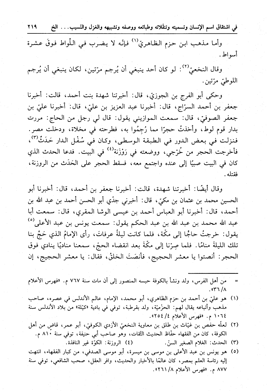 وقال النخعيّ : لو كان أحد ينبغي أن يرجم مرتين ، لكان ينبغي أن يرجم اللوطيّ مرتين . وحكى أبو الفرج بن الجوزيّ ، قال : أخبرتنا شهدة بنت أحمد ، قالت : أخبرنا جعفر بن أحمد السراج ، قال : أخبرنا عبد العزيز بن عليّ ، قال : أخبرنا عليّ بن جعفر الصوفي ، قال : سمعت الموازيني يقول : قال لي رجل من الحاج : مررت بدار قوم لوط ، وأخذت حجراً مما رجموا به ، فطرحته في مخلاة ، ودخلت مصر . فنزلت في بعض الدور في الطبقة الوسطى . وكان في سُفل الدار حدثٌ ، فأخرجت الحجر من خرجي ، ووضعته في روزنة في البيت . فدعا الحدث الذي كان في البيت صبياً إلى عنده واجتمع معه ، فسقط الحجر على الحدث من الروزنة ، فقتله .