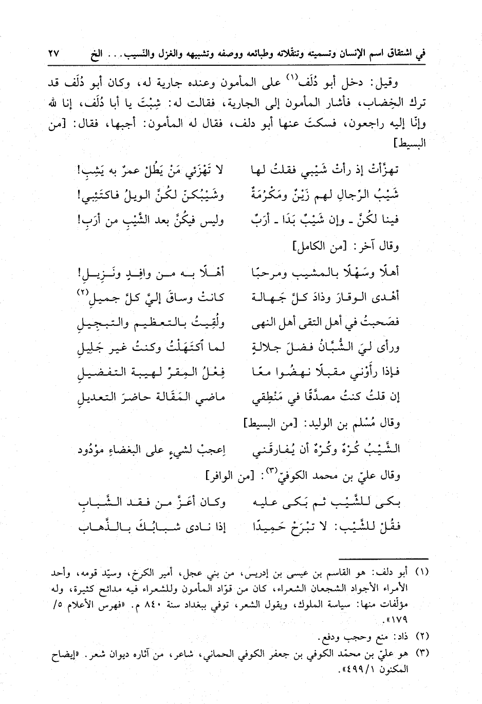 وقيل : دخل أبو دُلف على المأمون وعنده جارية له ، وكان أبو دلف قد ترك الخضاب ، فأشار المأمون إلى الجارية فقالت له : شبْت يا أبا دُلف ، إنا لله وإنا إليه راجعون . فسكت عنها أبو دلف ، فقال له المأمون : أجبها ، فقال :