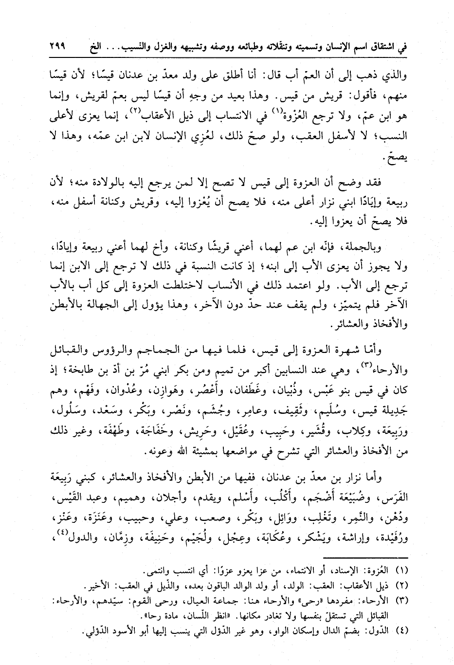 فقد وضح أن العزوة إلى قيس لا تصح إلا لمن يرجع إليه بالولادة منه : لأن ربيعة وإياداً ابنى نزار أعلى منه ، فلا يصح أن يعزوا إليه ؛ وقريش وكنانة أسفل منه فلا يصح أن يعزوا إليه .