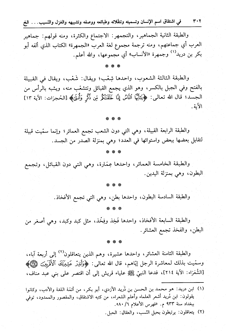والطبقة الثامنة العشائر ، وأحدها عشيرة : وهم الذين يتعاقلون إلى أربعة آباء . وسميت بذلك لمعاشرة الرجل إياهم ، قال الله تعالى : " وأنذر عشيرتك الأقربين " . فدعا النبي ( صلى الله عليه وسلم ) علياء قريش إلى أن اقتصر على بني عبد مناف ؛