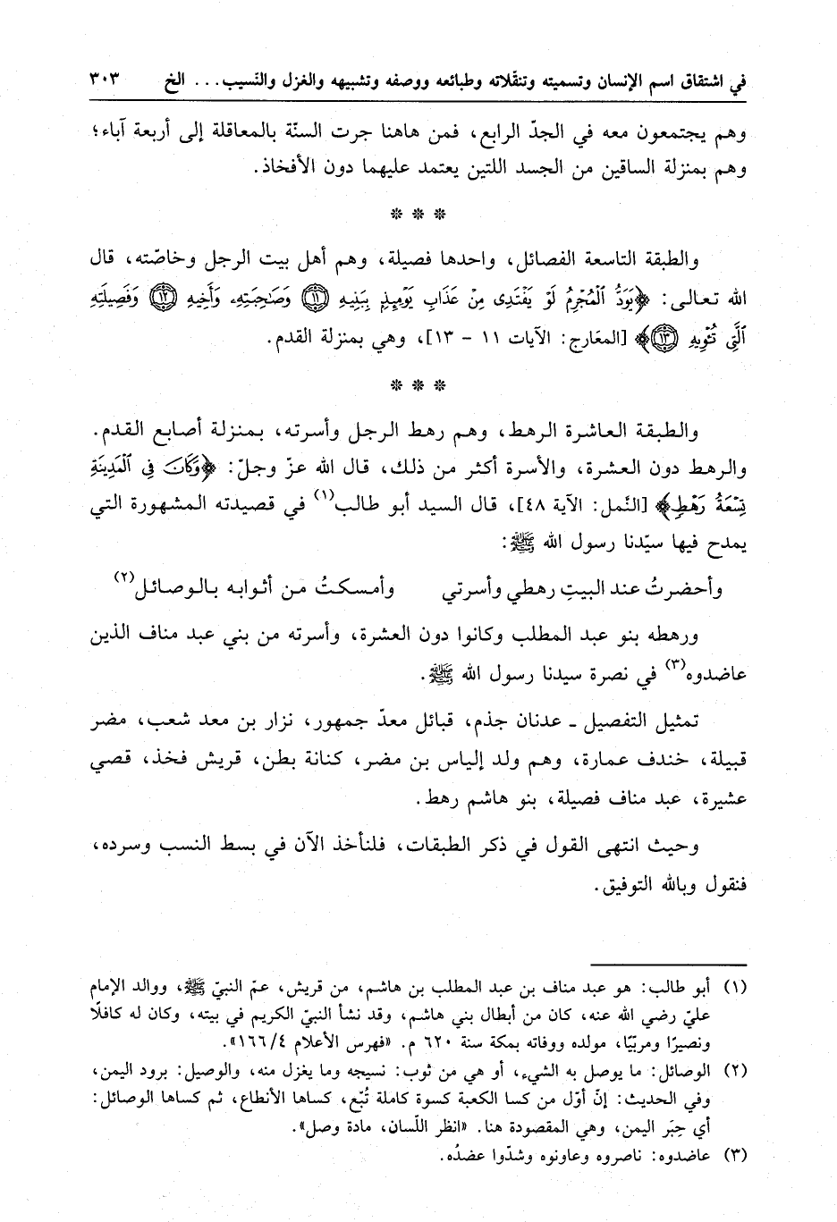 تمثيل التفصيل - عدنان جذم ، قبائل معد جمهور ، نزار بن معد شعب ، مضر قبيلة ، خندف عمارة : وهم ولد إلياس بن مضر ، كنانة بطن قريش فخذ ، قصي عشيرة ، عبد مناف فصيلة ، بنو هاشم رهط .