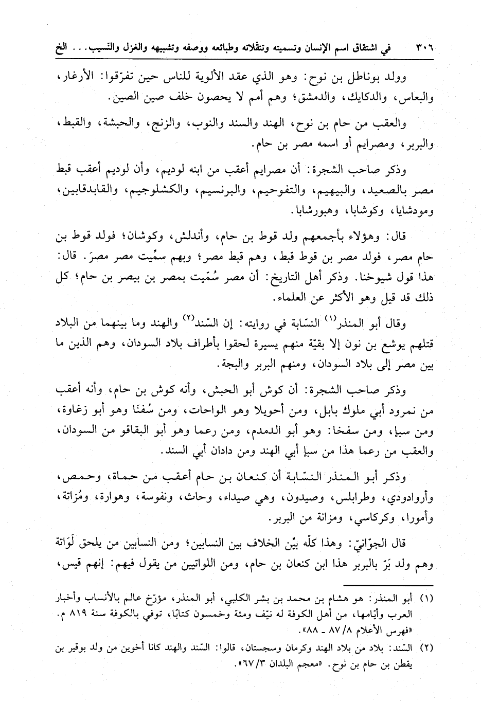 وذكر أبو المنذر النسابة أن كنعان بن حام أعقب من حماة ، وحمص ، واروادودي ، وطرابلس ، وصيدون ، وهي صيداء ، وحاث ، ونفوسة ، وهوارة ، ومزاتة ، وامورا ، وكركاسي ، ومزانة من البربر . قال الجوّانيّ : وهذا كلّه بيِّن الخلاف بين النسابين ؛ ومن النسابين من يلحق لواتة وهم ولد برّ بالبربر هذا بن كنعان بن حام ، ومن اللواتيّين من يقول فيهم : إنهم قيس ،