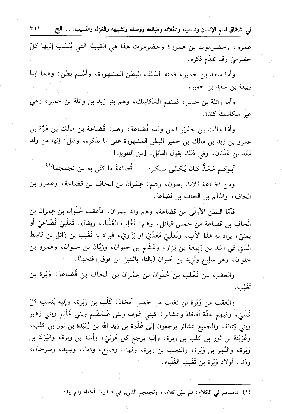 فأما البطن الأولى من قضاعة : وهم ولد عمران ، فأعقب حلوان بن عمران بن الحاف بن قضاعة من خمس قبائل : وهم تغلب الغلباء ، ويقال : تغلبي قضاعي أو يمني ، يراد به هذا الأب ؛ وتغلبي معدي أو نزاري ، فيراد به تغلب بن وائل بن قاسط الذي في أسد بن ربيعة بن نزار ؛ وعشم بن حلوان ، وزبان بن حلوان ، وعمرو بن حلوان وهو سليح وتزيد بن حلوان بالتاء باثنتين من فوق وفتحها .