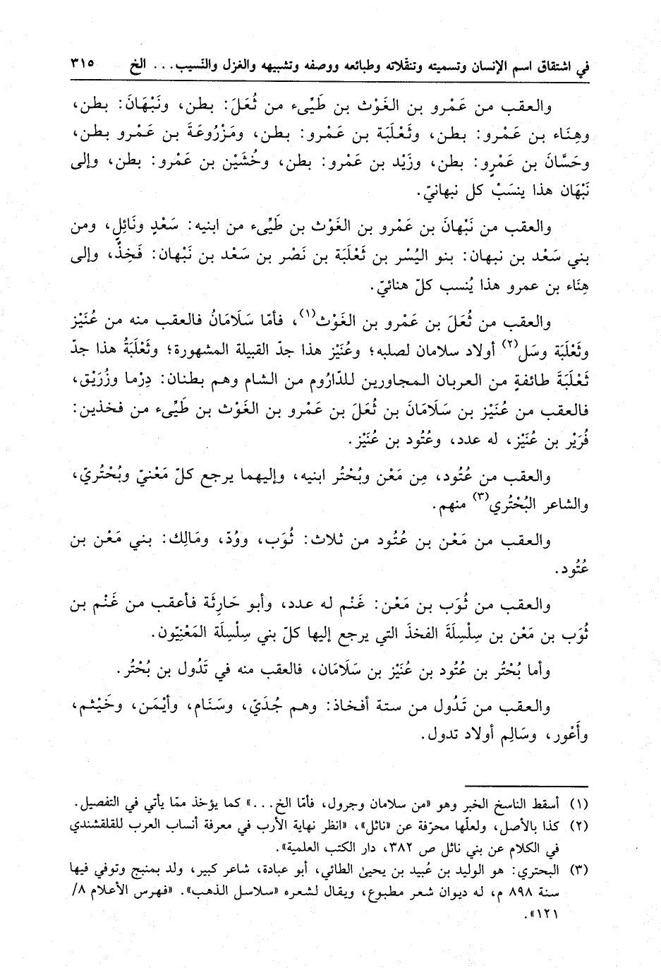 والعقب من ثعل بن عمرو بن الغوث . فأما سلامان فالعقب منه من عنيز وثعلبة وسل أولاد سلامان لصلبه ؛ وعنيز هذا جد القبيلة المشهورة ؛ وثعلبة هذا جد ثعلبة طائفة من العربان المجاورين للداروم من الشام وهم بطنان : درما وزريق ، فالعقب من عنيز بن سلامان بن ثعل بن عمرو بن الغوث بن طيء من فخذين : فرير بن عنيز ، له عدد ، وعتود بن عنيز .