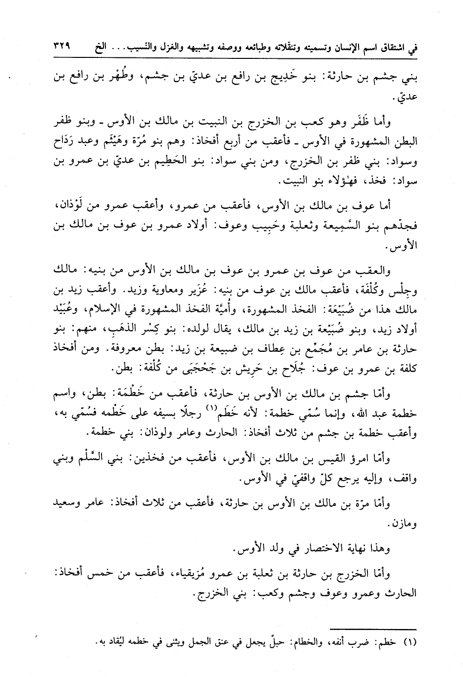 وأما جشم بن مالك بن الأوس بن حارثة ، فأعقب من خطمة : بطن ؛ واسم خطمة عبد الله ، وإنما سمي خطمة : لأنه خطم رجلاً بسيفه على خطمه فسمي به ، وأعقب خطمة بن جشم من ثلاث أفخاذ : الحارث وعامر ولوذان : بني خطمة .