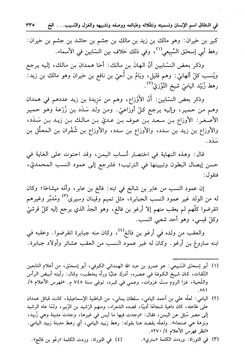 قال : وهذه النهاية في اختصار أنساب اليمن . وقد احتوت على الغاية في حسن إيصال البطون وتبيينها في الترتيب ؛ فلنرجع إلى عمود النسب المحمديّ فنقول : إن عمود النسب من عابر بن شالخ في ابنه : فالغ بن عابر ؛ وأمّه ميشاخا ؛ وكان له من الولد غير عمود النسب الجبابرة ، مثل تميم وقينان وسيري ومُدبِّر وغيرهم انقرضوا كلهم لم يعقب منهم إلا أرغو بن فالغ ، وهو الجدّ الذي يرجع إليه كلّ قرشيّ وكل قيسي ، وهو أحد شعبي النسب .