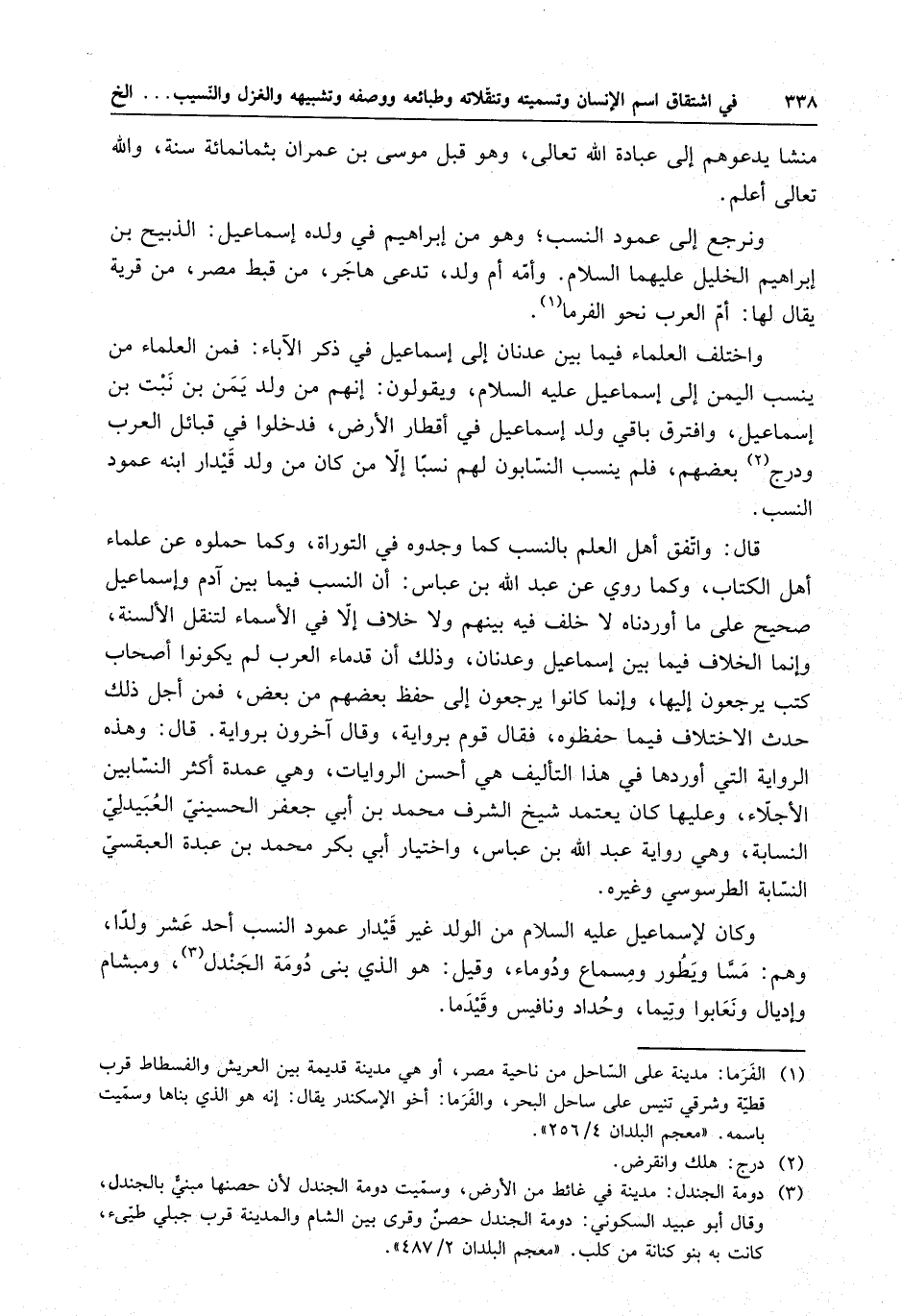 قال : واتفق أهل العلم بالنسب كما وجدوه في التوراة وكما حملوه من علماء أهل الكتاب ، وكما روي عن عبد الله بن عباس : أن النسب فيما بين آدم وإسماعيل صحيح على ما أوردناه لا خلف فيه بينهم ولا خلف إلا في الأسماء لتنقل الألسنة ، وإنما الخلاف فيما بين إسماعيل وعدنان ، وذلك أن قدماء العرب لم يكونوا أصحاب كتب يرجعون إليها ، وإنما كانوا يرجعون إلى حفظ بعضهم من بعض ، فمن أجل ذلك حدث الاختلاف فيما حفظوه ، فقال قوم برواية وقال آخرون برواية . قال : وهذه الرواية التي أوردها في هذا التأليف هي أحسن الروايات ، وهي عمدة أكثر النسّابين الأجلاّء ، وعليها كان يعنمد شيخ الشرف محمد بن أبي جعفر الحسينيّ العُبيدليّ النسابة ، وهي رواية عبد الله بن عباس ، واختيار أبي بكر محمد بن عبده العبقسيّ النسّابة الطرسوسي وغيره .