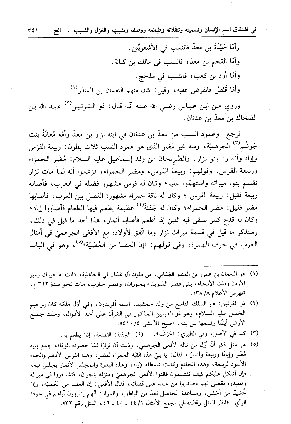 نرجع . وعمود النسب من معدّ بن عدنان في ابنه نزار بن معدّ وأمّه مُعانة بنت جوشم الجرهمية ، ومنه غير مضر الذي هو عمود النسب ثلاث بطون : ربيعة الفرس وإياد وأنمار : بنو نزار . والصَّريحان من ولد إسماعيل عليه السلام : مُضر الحمراء وربيعة الفرس . وقولهم : ربيعة الفرس ومضر الحمراء ، فزعموا أنه لما مات نزار تقسم بنوه ميراثه واستهموا عليه ؛ وكان له فرس ، مشهور فضله في العرب فأصابه ربيعة فقيل : ربيعة الفرس ؛ وكان له ناقة حمراء ، مشهورة الفضل بين العرب فأصابها مضر فقيل : مضر الحمراء ؛ وكان له جفنةٌ عظيمة يطعم فيها الطعام فأصابها إياد ؛ وكان له قدح كبير يسقى فيه اللبن إذا أطعم فأصابه أنمار . هذا أحد ما قيل في ذلك ، وسنذكر ما قيل في قسمة ميراث نزار وما اتفق لأولاده مع الأفعى الجرهميّ في أمثال العرب في حرف الهمزة وفي قولهم : " إن العصا من العُصيّة " ، وهو في الباب