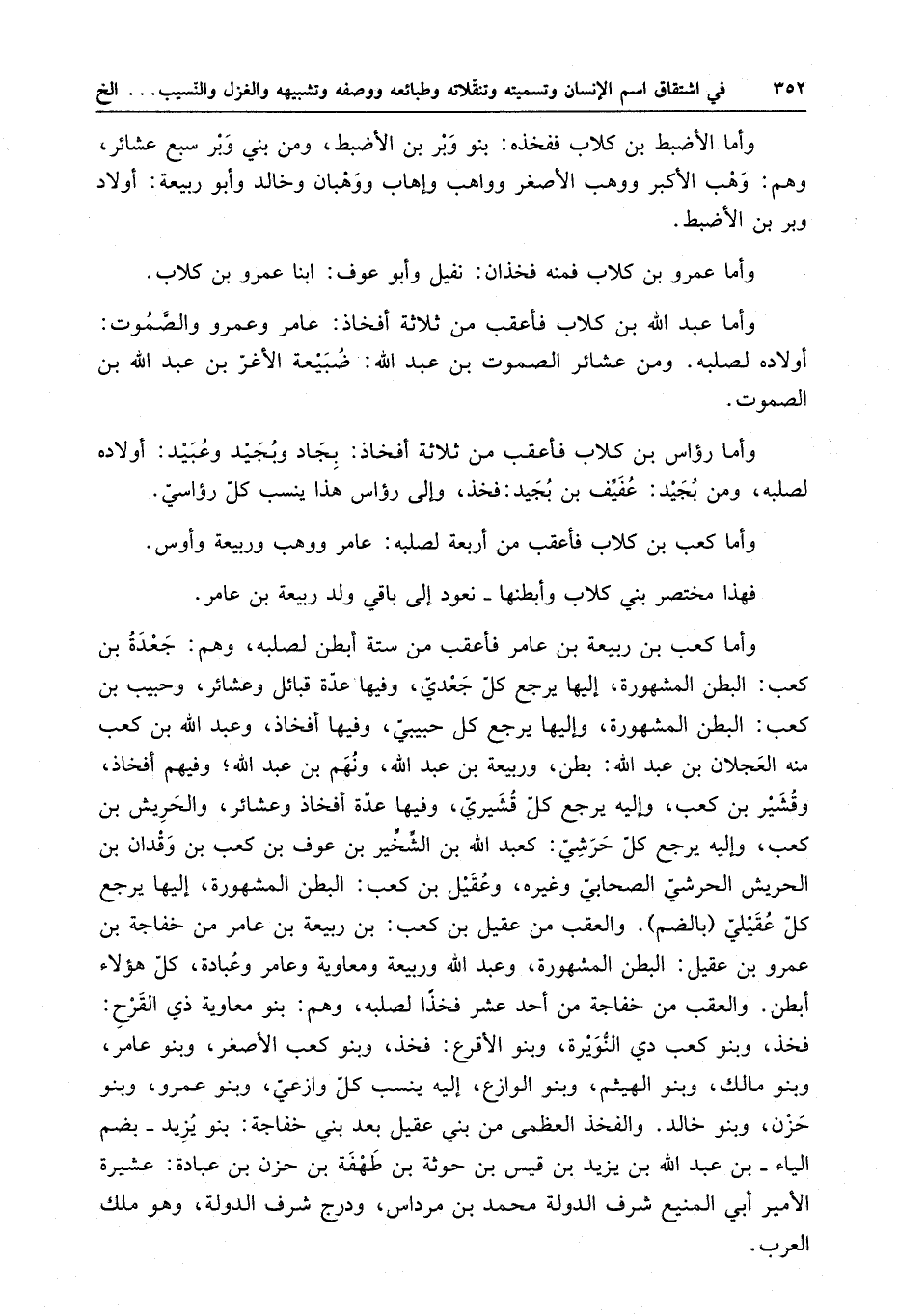 وأما كعب بن ربيعة بن عامر فأعقب من ستة أبطن لصلبه : وهم جعدة بن كعب : البطن المشهورة ؛ إليها يرجع كلّ جعديّ ؛ وفيها عدة قبائل وعشائر ، وحبيب بن كعب : البطن المشهورة ؛ وإليها يرجع كلّ حبيبيّ ؛ وفيها أفخاذ ، وعبد الله بن كعب منه العجلان بن عبد الله : بطن ، وربيعة بن عبد الله ، ونهم بن عبد الله ؛ وفيهم أفخاذ ، وقُشير بن كعب ، وإليه يرجع كلّ قُشيريّ ؛ وفيها عدة أفخاذ وعشائر ، والحريش بن كعب ، وإليه يرجع كلّ حرشيّ : كعبد الله بن الشِّخِّير بن عوف بن كعب بن وقدان بن الحريش الحرشيّ الصحابيّ وغيره ، وعُقيل بن كعب : البطن المشهورة ، إليها يرجع كلّ عُقيليّ بالضم . والعقب من عقيل بن كعب : بن ربيعة بن عامر من خفاجة بن عمرو بن عقيل : البطن المشهورة ، وعبد الله وربيعة ومعاوية وعامر وعُبادة ؛ كل هؤلاء أبطن . والعقب من خفاجة من أحد عشر فخذاً لصلبه : وهم بنو معاوية ذي القرح : فخذ ، وبنو كعب ذي النُّويرة ، وبنو الأقرع : فخذ ، وبنو كعب الأصغر ، وبنو عامر ، وبنو مالك ، وبنو الهيثم ، وبنو الوازع ؛ إليه ينسب كلّ وازعيّ ، وبنو عمرو ، وبنو حزن ، وبنو خالد . والفخذ العظمى من بني عقيل بعد بني خفاجة : بنو يُزيد بضم الياء بن عبد الله بن يزيد بن قيس بن حوثة بن طهفة بن حزن بن عبادة : عشيرة الأمير أبي المنيع شرف الدولة محمد بن مرداس ؛ ودرج شرف الدولة ، وهو ملك العرب .