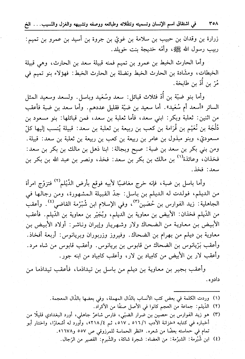 وأما بنو ضبة بن أدّ فثلاث قبائل : سعد وسعيد وباسل . ولسعد وسعيد المثل السائر أسعد أم سُعيد . أما سعيد بن ضبة فقليل عددهم . أما سعد بن ضبة فأعقب من اثنين : ثعلبة وبكر : ابني سعد ؛ فأما ثعلبة بن سعد ، فمن قبائلها : بنو مسعود بن دُلجة بن نُعيم بن قُرامة بن كعب بن ربيعة بن ثعلبة بن سعد : قبيلة يُنسب إليها كلّ مسعوديّ ، وبنو مبذول بن عامر بن ربيعة بن كعب بن ربيعة بن ثعلبة بن سعد : قبيلة . ومن بني بكر بن سعد بن ضبة : صبح وبجالة : ابنا ذهل بن مالك بن بكر بن سعد : فخذان ، وعائذة بن مالك بن بكر بن سعد : فخذ ، ونصر بن عبد الله بن بكر بن سعد : فخذ .