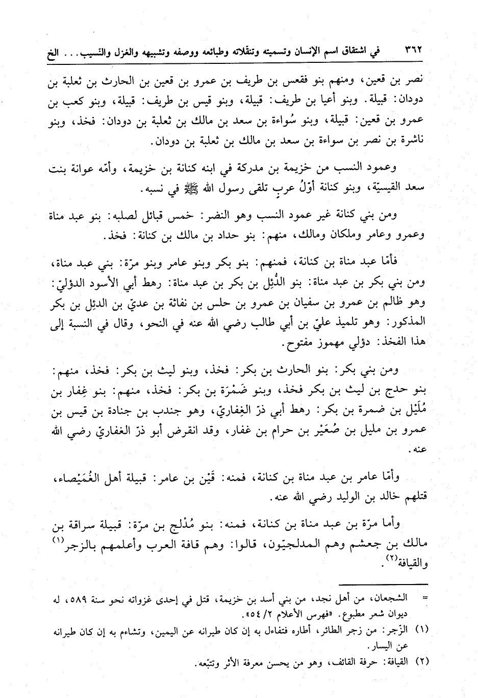 فأما عبد مناة بن كنانة ، فمنهم : بنو بكر وبنو عامر وبنو مرة : بني عبد مناة ، ومن بني بكر بن عبد مناة : بنو الدُّئل بن بكر بن عبد مناة : رهط أبي الأسود الدؤليّ : وهو ظالم بن عمرو بن سفيان بن عمرو بن حلس بن نفاثة بن عديّ بن الدئل بن بكر المذكور : وهو تلميذ عليّ بن أبي طالب رضي الله عنه في النحو ، ويقال في النسبة إلى هذا الفخذ : دؤلي مهموز مفتوح . ومن بني بكر : بنو الحارث بن بكر : فخذ ، وبنو ليث بن بكر : فخذ ؛ منهم : بنو حدج بن ليث بن بكر فخذ ، وبنو ضمرة بن بكر : فخذ . منهم : بنو غفار بن مُليل بن ضمرة بن بكر : رهط أبي ذرّ الغفاريّ : وهو جندب بن جنادة بن قيس بن عمرو بن مليل بن صُعير بن حرام بن غفار ، وقد انقرض أبو ذرّ الغفاريّ رضي الله عنه .