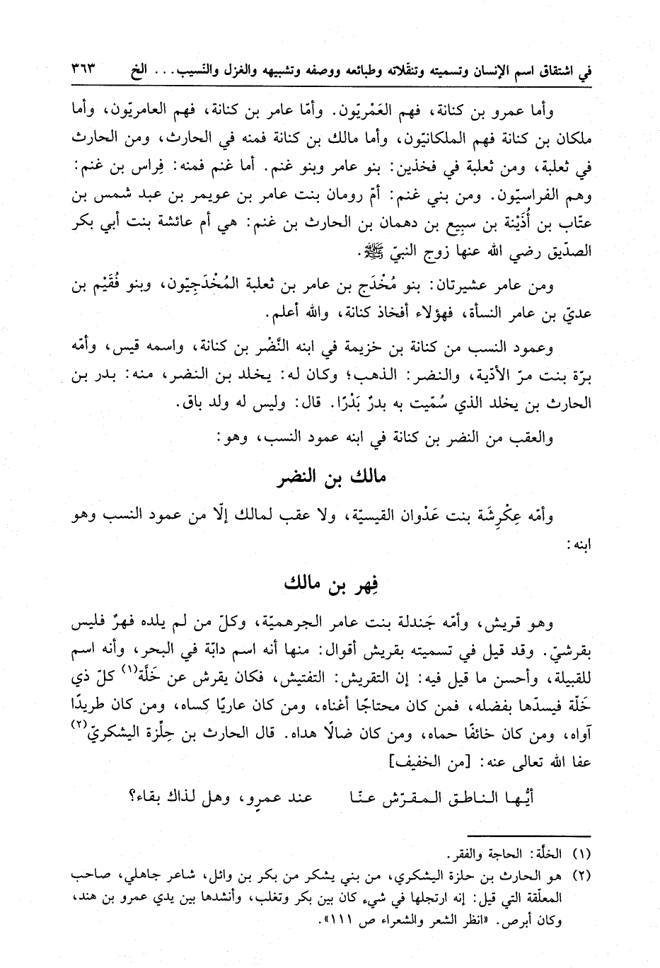 ومن عامر عشيرتان : بنو مخدج بن عامر بن ثعلبة المخدجيون ، وبنو فُقيم بن عديّ بن عامر النسأة . فهؤلاء أفخاذ كنانة ؛ والله أعلم .