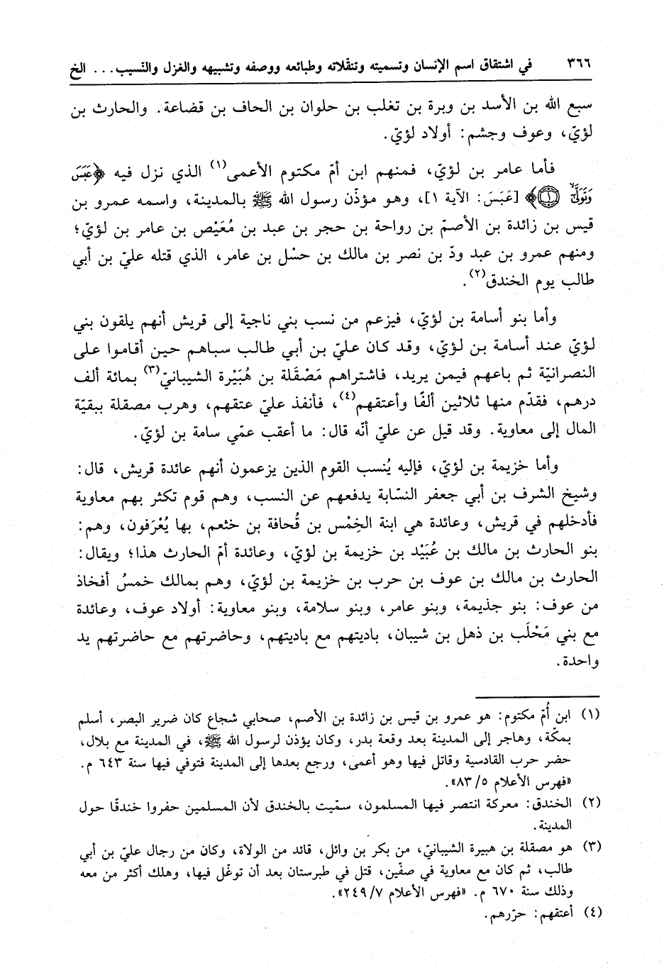 فأما عامر بن لؤيّ ، فمنهم ابن أمّ مكتوم الأعمى الذي نزل فيه " عبس وتولَّى " وهو مؤذن رسول الله ( صلى الله عليه وسلم ) بالمدينة ؛ واسمه عمرو بن قيس بن زائدة بن الأصم بن رواحة بن حجر بن عبد بن مُعيص بن عامر بن لؤيّ ؛ ومنهم عمرو بن عبدودّ بن نصر بن مالك بن حسل بن عامر ، الذي قتله عليّ بن أبي طالب يوم الخندق .