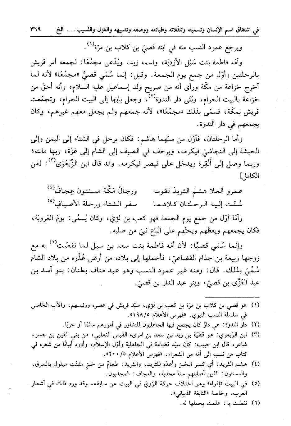 وإنما سمي قصياً : لأن أمه فاطمة بنت سعد بن سيل لما تقصت به مع زوجها ربيعة بن جذام الفضاعيّ ، فأحملها إلى بلاده من أرض عذرة من بلاد الشام سُمي بذلك . قال : ومنه غير عمود النسب وهو عبد مناف بطنان : بنو أسد بن عبد العُزَّى بن قصيّ ، وبنو عبد الدار بن قصيّ .