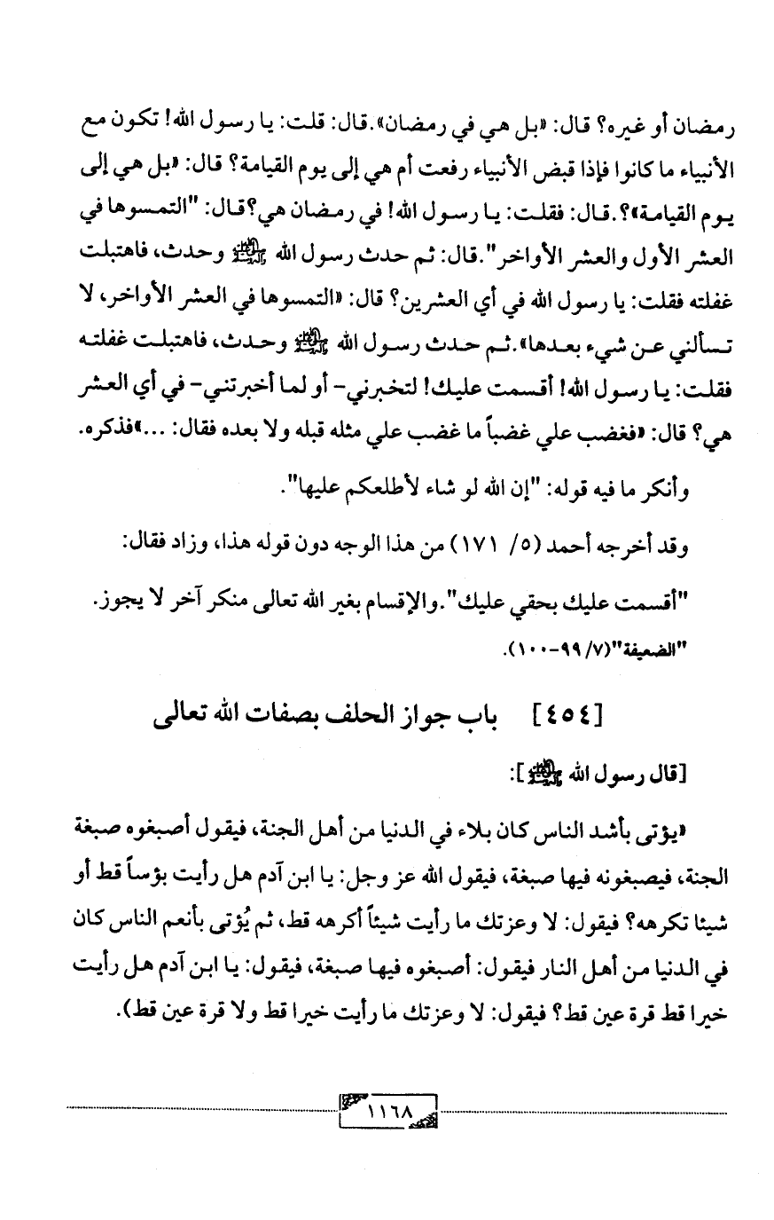 «يؤتى بأشد الناس كان بلاء في الدنيا من أهل الجنة، فيقول أصبغوه صبغة الجنة، فيصبغونه فيها صبغة، فيقول الله عز وجل: يا ابن آدم هل رأيت بؤساً قط أو شيئا تكرهه؟ فيقول: لا وعزتك ما رأيت شيئاً أكرهه قط، ثم يُؤتى بأنعم الناس كان في الدنيا من أهل النار فيقول: أصبغوه فيها صبغة، فيقول: يا ابن آدم هل رأيت خيرا قط قرة عين قط؟ فيقول: لا وعزتك ما رأيت خيرا قط ولا قرة عين قط).