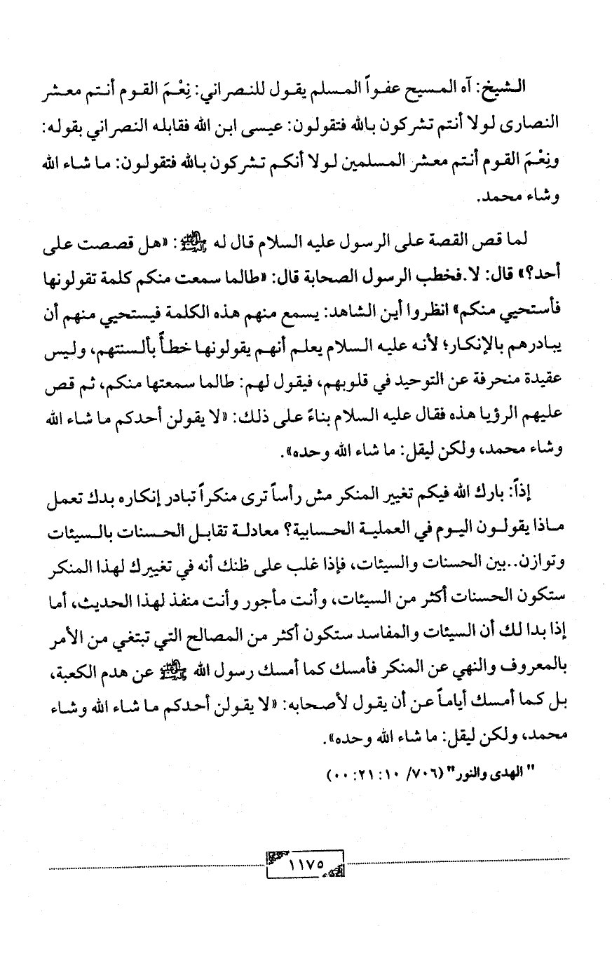 الشيخ: آه المسيح عفواً المسلم يقول للنصراني: نِعْمَ القوم أنتم معشر النصارى لولا أنتم تشركون بالله فتقولون: عيسى ابن الله فقابله النصراني بقوله: ونِعْمَ القوم أنتم معشر المسلمين لولا أنكم تشركون بالله فتقولون: ما شاء الله