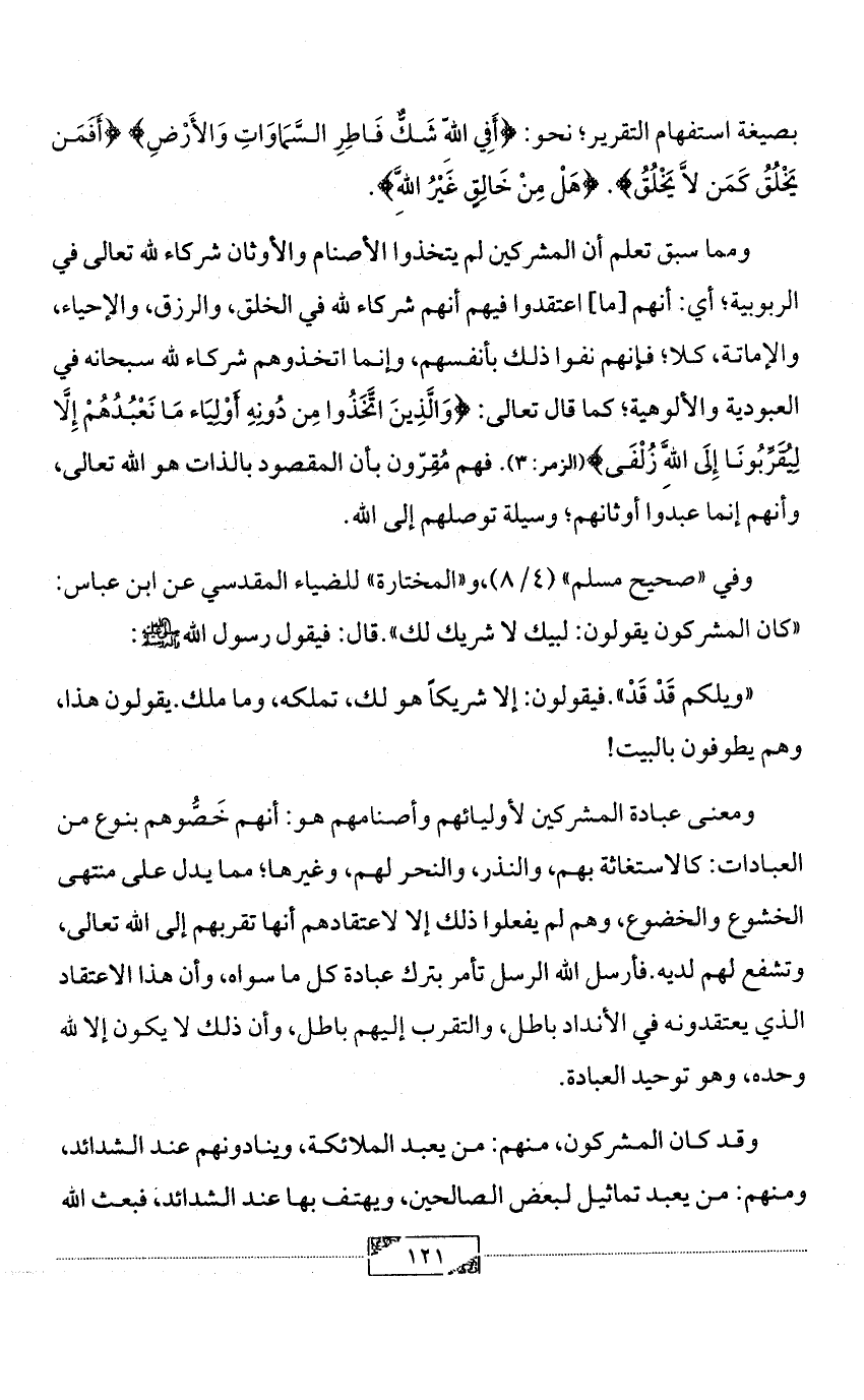 ومما سبق تعلم أن المشركين لم يتخذوا الأصنام والأوثان شركاء لله تعالى في الربوبية؛ أي: أنهم [ما] اعتقدوا فيهم أنهم شركاء لله في الخلق, والرزق, والإحياء, والإماتة, كلا؛ فإنهم نفوا ذلك بأنفسهم, وإنما اتخذوهم شركاء لله سبحانه في العبودية والألوهية؛ كما قال تعالى: {وَالَّذِينَ اتَّخَذُوا مِن دُونِهِ أَوْلِيَاء مَا نَعْبُدُهُمْ إِلَّا لِيُقَرِّبُونَا إِلَى اللَّهِ زُلْفَى} (الزمر: 3). فهم مُقِرّون بأن المقصود بالذات هو الله تعالى, وأنهم إنما عبدوا أوثانهم؛ وسيلة توصلهم إلى الله.