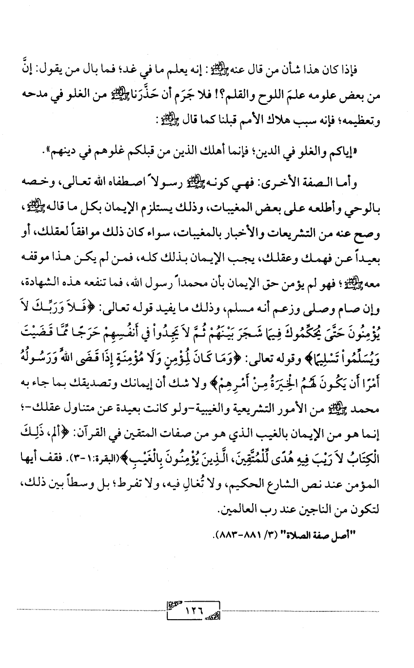 فإذا كان هذا شأن من قال عنه - صلى الله عليه وآله وسلم -: إنه يعلم ما في غد؛ فما بال من يقول: إنَّ من بعض علومه علمَ اللوح والقلم؟! فلا جَرَم أن حَذَّرَنا - صلى الله عليه وآله وسلم - من الغلو في مدحه وتعظيمه؛ فإنه سبب هلاك الأمم قبلنا كما قال - صلى الله عليه وآله وسلم -: