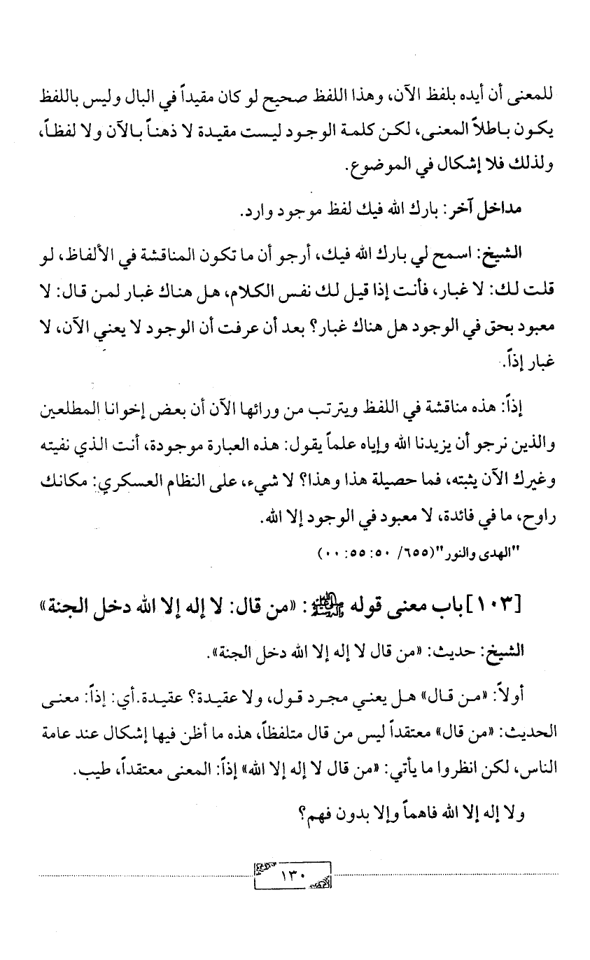 الشيخ: اسمح لي بارك الله فيك، أرجو أن ما تكون المناقشة في الألفاظ، لو قلت لك: لا غبار، فأنت إذا قيل لك نفس الكلام، هل هناك غبار لمن قال: لا معبود بحق في الوجود هل هناك غبار؟ بعد أن عرفت أن الوجود لا يعني الآن، لا غبار إذاً.