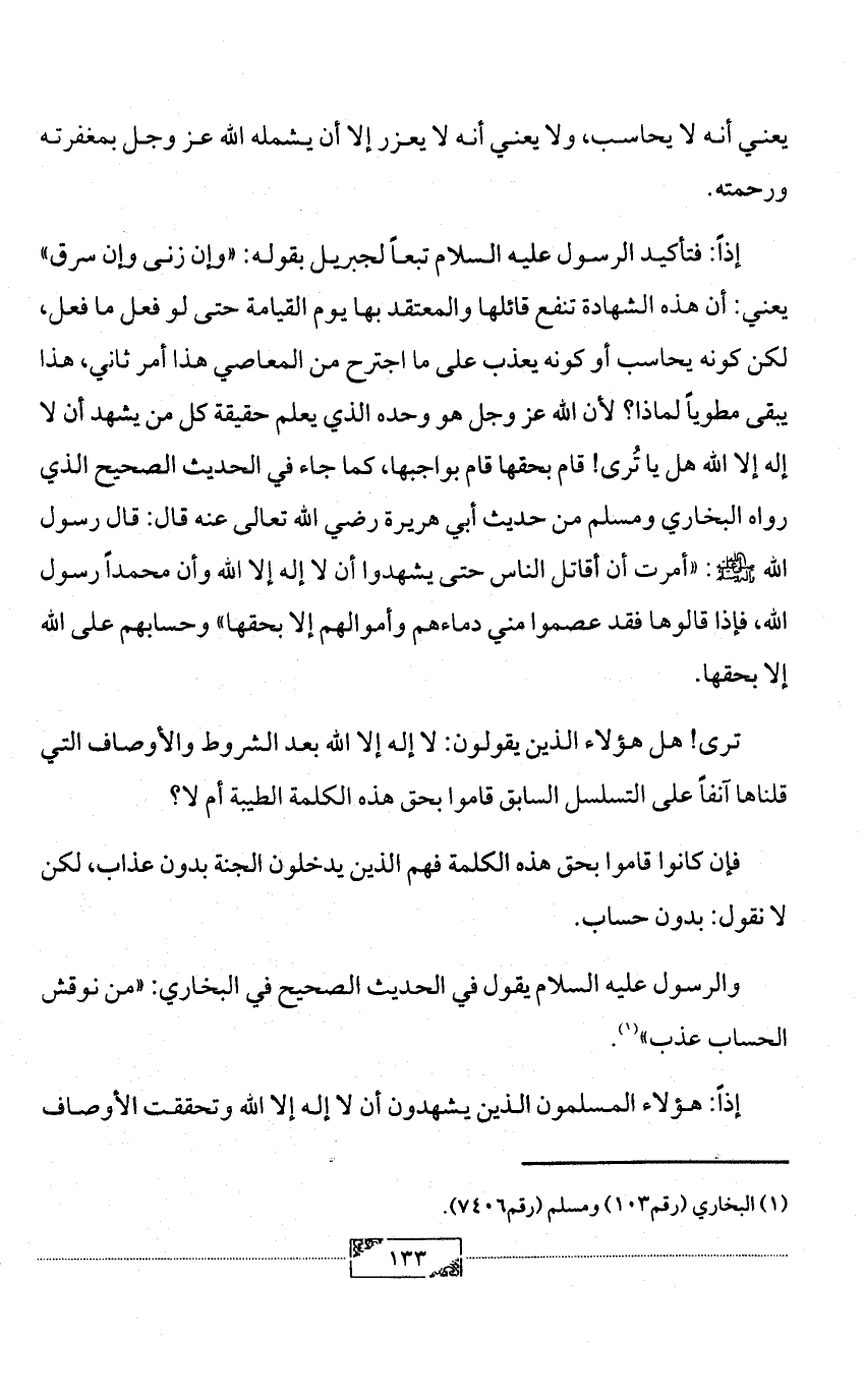 إذاً: فتأكيد الرسول عليه السلام تبعاً لجبريل بقوله: «وإن زنى وإن سرق» يعني: أن هذه الشهادة تنفع قائلها والمعتقد بها يوم القيامة حتى لو فعل ما فعل، لكن كونه يحاسب أو كونه يعذب على ما اجترح من المعاصي هذا أمر ثاني، هذا يبقى مطوياً لماذا؟ لأن الله عز وجل هو وحده الذي يعلم حقيقة كل من يشهد أن لا إله إلا الله هل يا تُرى! قام بحقها قام بواجبها، كما جاء في الحديث الصحيح الذي رواه البخاري ومسلم من حديث أبي هريرة رضي الله تعالى عنه قال: قال رسول الله - صلى الله عليه وآله وسلم -: «أمرت أن أقاتل الناس حتى يشهدوا أن لا إله إلا الله وأن محمداً رسول الله، فإذا قالوها فقد عصموا مني دماءهم وأموالهم إلا بحقها» وحسابهم على الله إلا بحقها.
