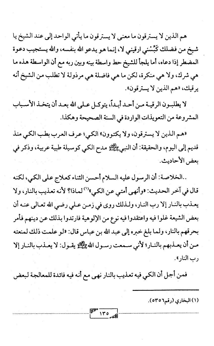 «هم الذين لا يسترقون، ولا يكتوون» الكي؛ عرف العرب بطب الكي منذ قديم إلى اليوم، والحقيقة: أن النبي - صلى الله عليه وآله وسلم - مدح الكي كوسيلة طبية عربية، وذكر في بعض الأحاديث.