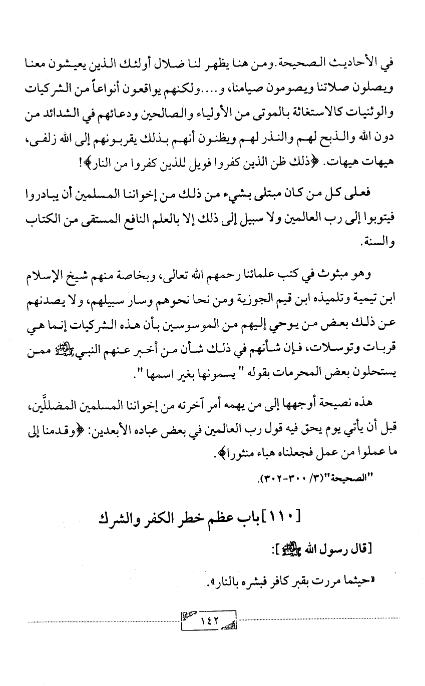 في الأحاديث الصحيحة. ومن هنا يظهر لنا ضلال أولئك الذين يعيشون معنا ويصلون صلاتنا ويصومون صيامنا، و .... ولكنهم يواقعون أنواعاً من الشركيات والوثنيات كالاستغاثة بالموتى من الأولياء والصالحين ودعائهم في الشدائد من دون الله والذبح لهم والنذر لهم ويظنون أنهم بذلك يقربونهم إلى الله زلفى، هيهات هيهات. {ذلك ظن الذين كفروا فويل للذين كفروا من النار}!