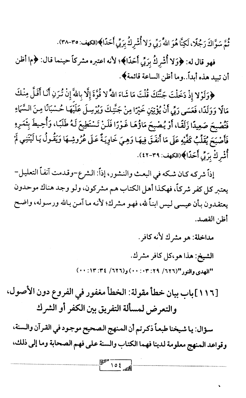 [116] باب بيان خطأ مقولة: الخطأ مغفور في الفروع دون الأصول، والتعرض لمسألة التفريق بين الكفر أو الشرك