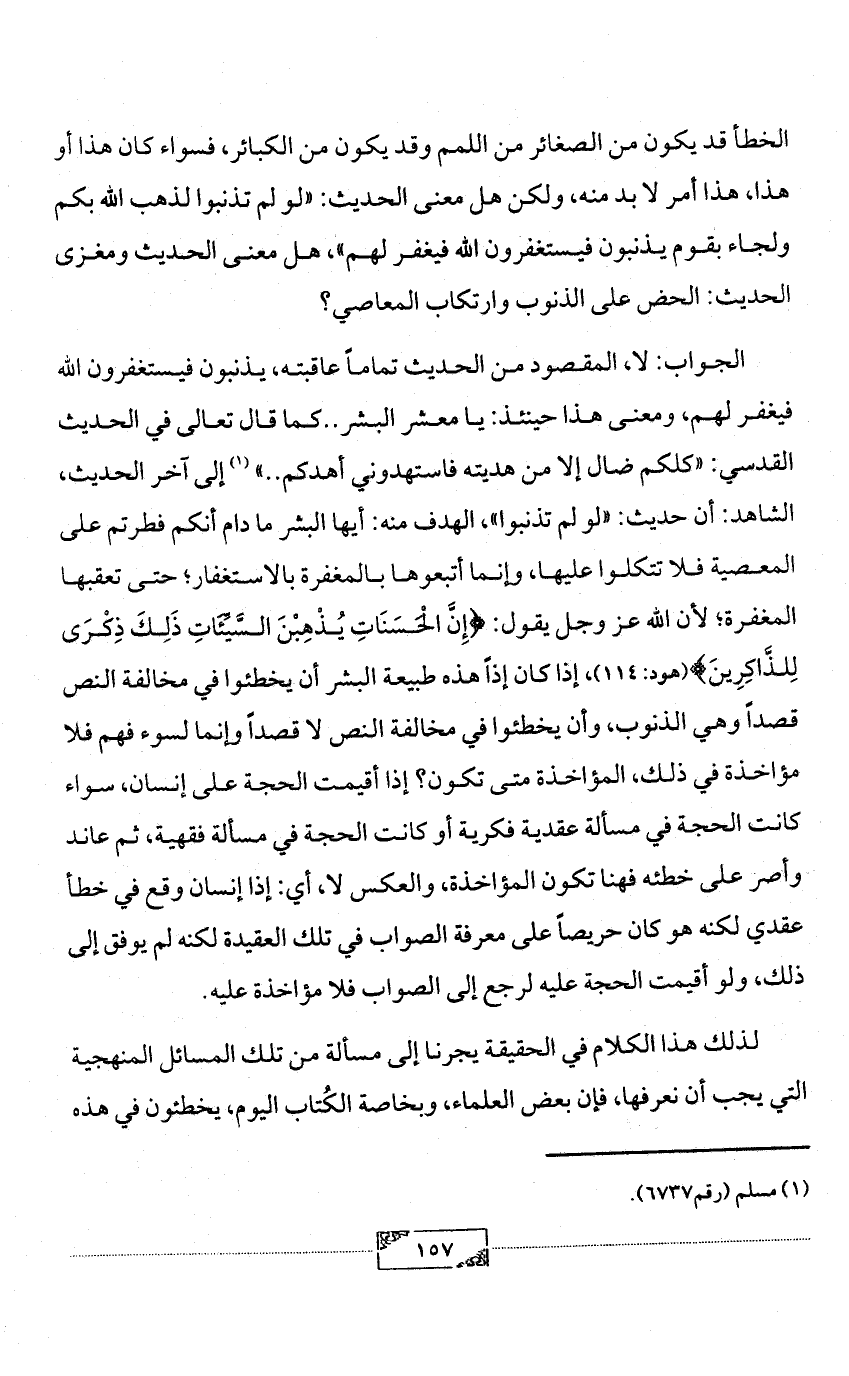 الجواب: لا، المقصود من الحديث تماماً عاقبته، يذنبون فيستغفرون الله فيغفر لهم، ومعنى هذا حينئذ: يا معشر البشر .. كما قال تعالى في الحديث القدسي: «كلكم ضال إلا من هديته فاستهدوني أهدكم .. » (¬1) إلى آخر الحديث، الشاهد: أن حديث: «لو لم تذنبوا»، الهدف منه: أيها البشر ما دام أنكم فطرتم على المعصية فلا تتكلوا عليها، وإنما أتبعوها بالمغفرة بالاستغفار؛ حتى تعقبها المغفرة؛ لأن الله عز وجل يقول: {إِنَّ الْحَسَنَاتِ يُذْهِبْنَ السَّيِّئَاتِ ذَلِكَ ذِكْرَى لِلذَّاكِرِينَ} (هود: 114)، إذا كان إذاً هذه طبيعة البشر أن يخطئوا في مخالفة النص قصداً وهي الذنوب، وأن يخطئوا في مخالفة النص لا قصداً وإنما لسوء فهم فلا مؤاخذة في ذلك، المؤاخذة متى تكون؟ إذا أقيمت الحجة على إنسان، سواء كانت الحجة في مسألة عقدية فكرية أو كانت الحجة في مسألة فقهية، ثم عاند وأصر على خطئه فهنا تكون المؤاخذة، والعكس لا، أي: إذا إنسان وقع في خطأ عقدي لكنه هو كان حريصاً على معرفة الصواب في تلك العقيدة لكنه لم يوفق إلى ذلك، ولو أقيمت الحجة عليه لرجع إلى الصواب فلا مؤاخذة عليه.