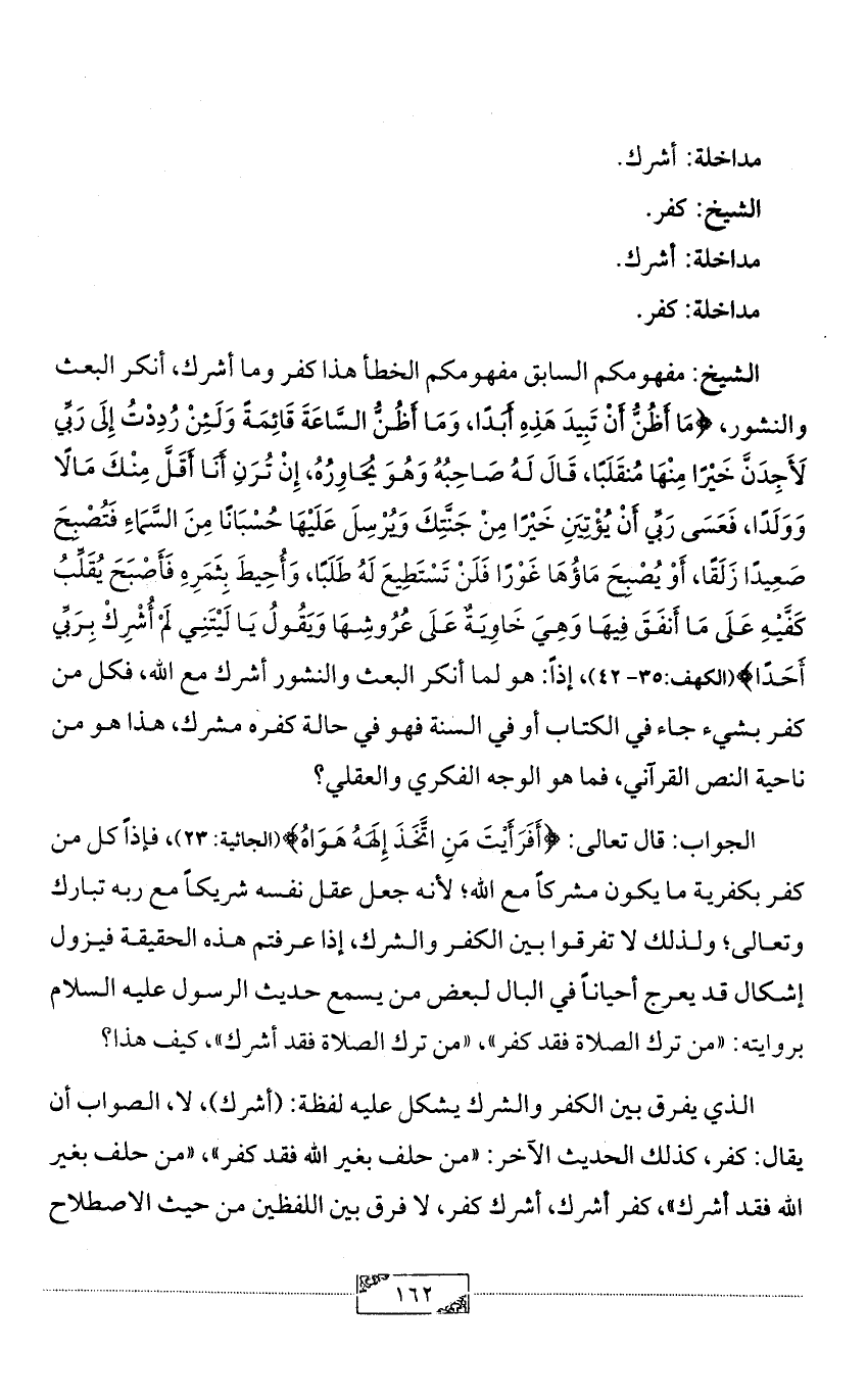 الشيخ: مفهومكم السابق مفهومكم الخطأ هذا كفر وما أشرك، أنكر البعث والنشور، {مَا أَظُنُّ أَنْ تَبِيدَ هَذِهِ أَبَدًا، وَمَا أَظُنُّ السَّاعَةَ قَائِمَةً وَلَئِنْ رُدِدْتُ إِلَى رَبِّي لَأَجِدَنَّ خَيْرًا مِنْهَا مُنقَلَبًا، قَالَ لَهُ صَاحِبُهُ وَهُوَ يُحَاوِرُهُ، إِنْ تُرَنِ أَنَا أَقَلَّ مِنْكَ مَالًا وَوَلَدًا، فَعَسَى رَبِّي أَنْ يُؤْتِيَنِ خَيْرًا مِنْ جَنَّتِكَ وَيُرْسِلَ عَلَيْهَا حُسْبَانًا مِنَ السَّمَاءِ فَتُصْبِحَ صَعِيدًا زَلَقًا، أَوْ يُصْبِحَ مَاؤُهَا غَوْرًا فَلَنْ تَسْتَطِيعَ لَهُ طَلَبًا، وَأُحِيطَ بِثَمَرِهِ فَأَصْبَحَ يُقَلِّبُ كَفَّيْهِ عَلَى مَا أَنفَقَ فِيهَا وَهِيَ خَاوِيَةٌ عَلَى عُرُوشِهَا وَيَقُولُ يَا لَيْتَنِي لَمْ أُشْرِكْ بِرَبِّي أَحَدًا} (الكهف:35 - 42)، إذاً: هو لما أنكر البعث والنشور أشرك مع الله، فكل من كفر بشيء جاء في الكتاب أو في السنة فهو في حالة كفره مشرك، هذا هو من ناحية النص القرآني، فما هو الوجه الفكري والعقلي؟