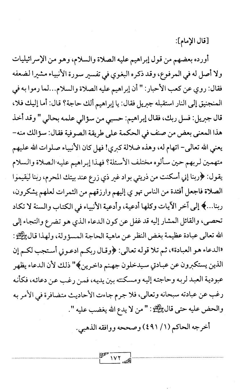 أورده بعضهم من قول إبراهيم عليه الصلاة والسلام، وهو من الإسرائيليات ولا أصل له في المرفوع، وقد ذكره البغوي في تفسير سورة الأنبياء مشيرا لضعفه فقال: روي عن كعب الأحبار: " أن إبراهيم عليه الصلاة والسلام ... لما رموا به في المنجنيق إلى النار استقبله جبريل فقال: يا إبراهيم ألك حاجة؟ قال: أما إليك فلا، قال جبريل: فسل ربك، فقال إبراهيم: حسبي من سؤالي علمه بحالي " وقد أخذ هذا المعنى بعض من صنف في الحكمة على طريقة الصوفية فقال: سؤالك منه-يعني الله تعالى- اتهام له، وهذه ضلالة كبري! فهل كان الأنبياء صلوات الله عليهم متهمين لربهم حين سألوه مختلف الأسئلة؟ فهذا إبراهيم عليه الصلاة والسلام يقول: {ربنا إني أسكنت من ذريتي بواد غير ذي زرع عند بيتك المحرم، ربنا ليقيموا الصلاة فاجعل أفئدة من الناس تهو ي إليهم وارزقهم من الثمرات لعلهم يشكرون، ربنا ... } إلى آخر الآيات وكلها أدعية، وأدعية الأنبياء في الكتاب والسنة لا تكاد تحصى، والقائل المشار إليه قد غفل عن كون الدعاء الذي هو تضرع والتجاء إلى الله تعالى عبادة عظيمة بغض النظر عن ماهية الحاجة المسؤولة، ولهذا قال - صلى الله عليه وآله وسلم -: «الدعاء هو العبادة»، ثم تلا قوله تعالى: {وقال ربكم ادعوني أستجب لكم إن الذين يستكبرون عن عبادتي سيدخلون جهنم داخرين} " ذلك لأن الدعاء يظهر عبودية العبد لربه وحاجته إليه ومسكنته بين يديه، فمن رغب عن دعائه، فكأنه رغب عن عبادته سبحانه وتعالى، فلا جرم جاءت الأحاديث متضافرة في الأمر به والحض عليه حتى قال - صلى الله عليه وآله وسلم -: " من لا يدع الله يغضب عليه ".