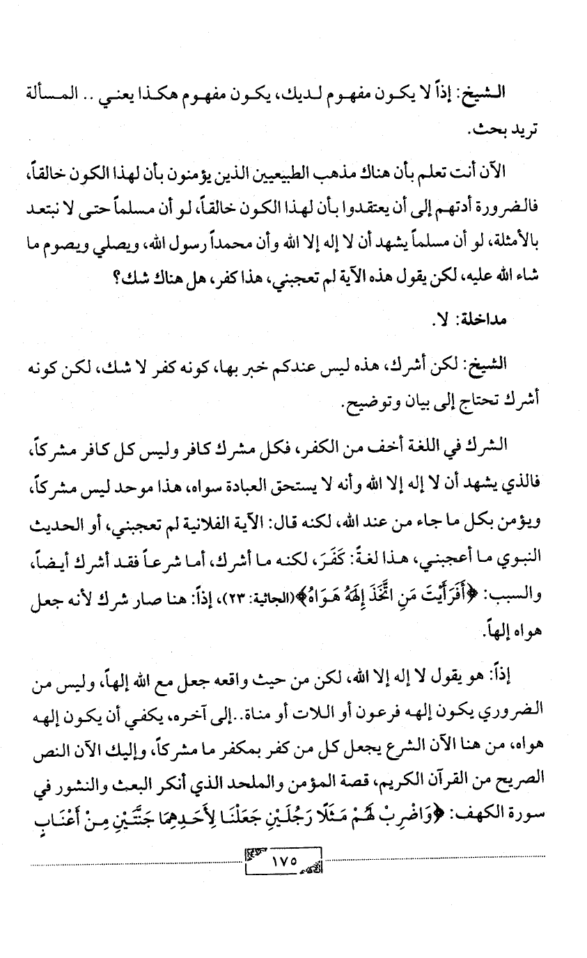إذاً: هو يقول لا إله إلا الله، لكن من حيث واقعه جعل مع الله إلهاً، وليس من الضروري يكون إلهه فرعون أو اللات أو مناة .. إلى آخره، يكفي أن يكون إلهه هواه، من هنا الآن الشرع يجعل كل من كفر بمكفر ما مشركاً، وإليك الآن النص الصريح من القرآن الكريم، قصة المؤمن والملحد الذي أنكر البعث والنشور في سورة الكهف: {وَاضْرِبْ لَهُمْ مَثَلًا رَجُلَيْنِ جَعَلْنَا لِأَحَدِهِمَا جَنَّتَيْنِ مِنْ أَعْنَابٍ