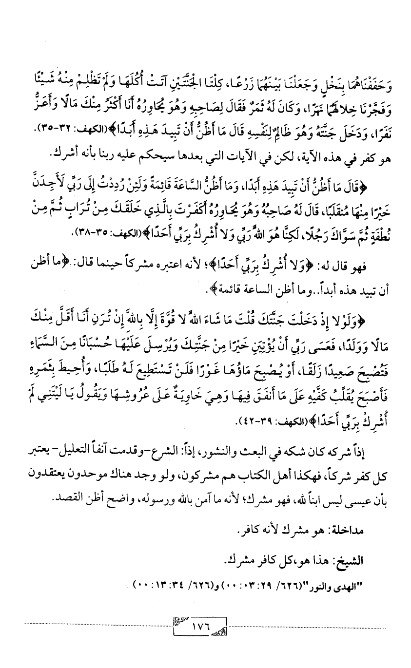 وَحَفَفْنَاهُمَا بِنَخْلٍ وَجَعَلْنَا بَيْنَهُمَا زَرْعًا، كِلْتَا الْجَنَّتَيْنِ آتَتْ أُكُلَهَا وَلَمْ تَظْلِمْ مِنْهُ شَيْئًا وَفَجَّرْنَا خِلالَهُمَا نَهَرًا، وَكَانَ لَهُ ثَمَرٌ فَقَالَ لِصَاحِبِهِ وَهُوَ يُحَاوِرُهُ أَنَا أَكْثَرُ مِنْكَ مَالًا وَأَعَزُّ نَفَرًا، وَدَخَلَ جَنَّتَهُ وَهُوَ ظَالِمٌ لِنَفْسِهِ قَالَ مَا أَظُنُّ أَنْ تَبِيدَ هَذِهِ أَبَدًا} (الكهف: 32 - 35). هو كفر في هذه الآية، لكن في الآيات التي بعدها سيحكم عليه ربنا بأنه أشرك.