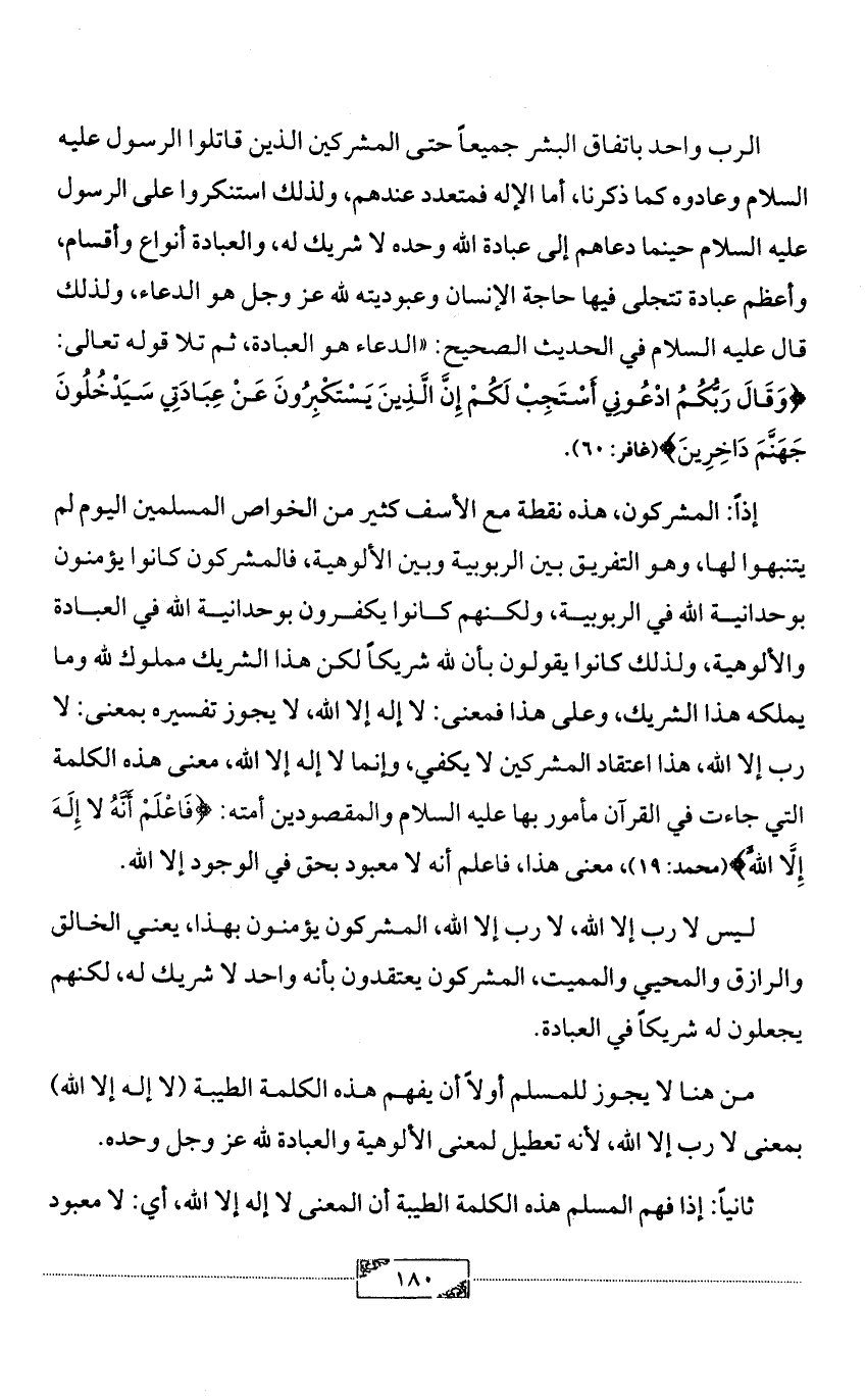 الرب واحد باتفاق البشر جميعاً حتى المشركين الذين قاتلوا الرسول عليه السلام وعادوه كما ذكرنا، أما الإله فمتعدد عندهم، ولذلك استنكروا على الرسول عليه السلام حينما دعاهم إلى عبادة الله وحده لا شريك له، والعبادة أنواع وأقسام، وأعظم عبادة تتجلى فيها حاجة الإنسان وعبوديته لله عز وجل هو الدعاء، ولذلك قال عليه السلام في الحديث الصحيح: «الدعاء هو العبادة، ثم تلا قوله تعالى: {وَقَالَ رَبُّكُمُ ادْعُونِي أَسْتَجِبْ لَكُمْ إِنَّ الَّذِينَ يَسْتَكْبِرُونَ عَنْ عِبَادَتِي سَيَدْخُلُونَ جَهَنَّمَ دَاخِرِينَ} (غافر: 60).