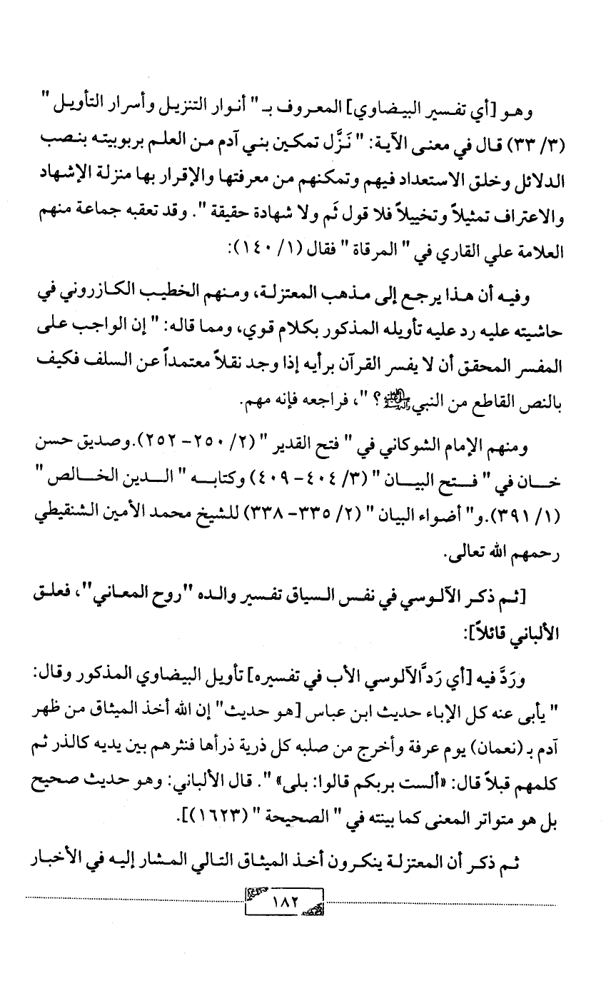 ورَدَّ فيه [أي رَد َّالآلوسي الأب في تفسيره] تأويل البيضاوي المذكور وقال: " يأبى عنه كل الإباء حديث ابن عباس [هو حديث" إن الله أخذ الميثاق من ظهر آدم بـ (نعمان) يوم عرفة وأخرج من صلبه كل ذرية ذرأها فنثرهم بين يديه كالذر ثم كلمهم قبلاً قال: «ألست بربكم قالوا: بلى» ". قال الألباني: وهو حديث صحيح بل هو متواتر المعنى كما بينته في " الصحيحة " (1623)].