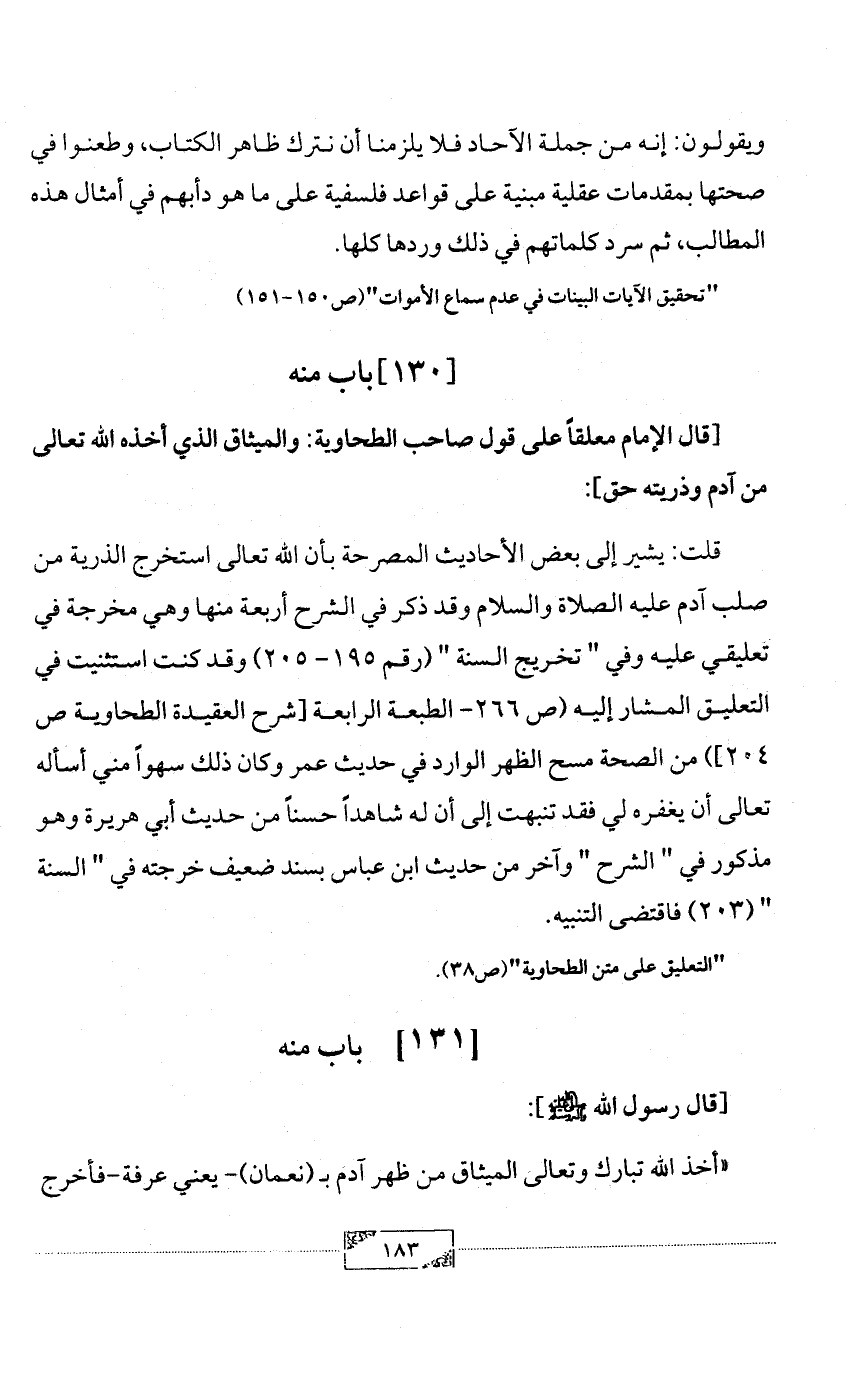 قلت: يشير إلى بعض الأحاديث المصرحة بأن الله تعالى استخرج الذرية من صلب آدم عليه الصلاة والسلام وقد ذكر في الشرح أربعة منها وهي مخرجة في تعليقي عليه وفي " تخريج السنة " (رقم 195 - 205) وقد كنت استثنيت في التعليق المشار إليه (ص 266 - الطبعة الرابعة [شرح العقيدة الطحاوية ص 204]) من الصحة مسح الظهر الوارد في حديث عمر وكان ذلك سهواً مني أسأله تعالى أن يغفره لي فقد تنبهت إلى أن له شاهداً حسناً من حديث أبي هريرة وهو مذكور في " الشرح " وآخر من حديث ابن عباس بسند ضعيف خرجته في " السنة " (203) فاقتضى التنبيه.