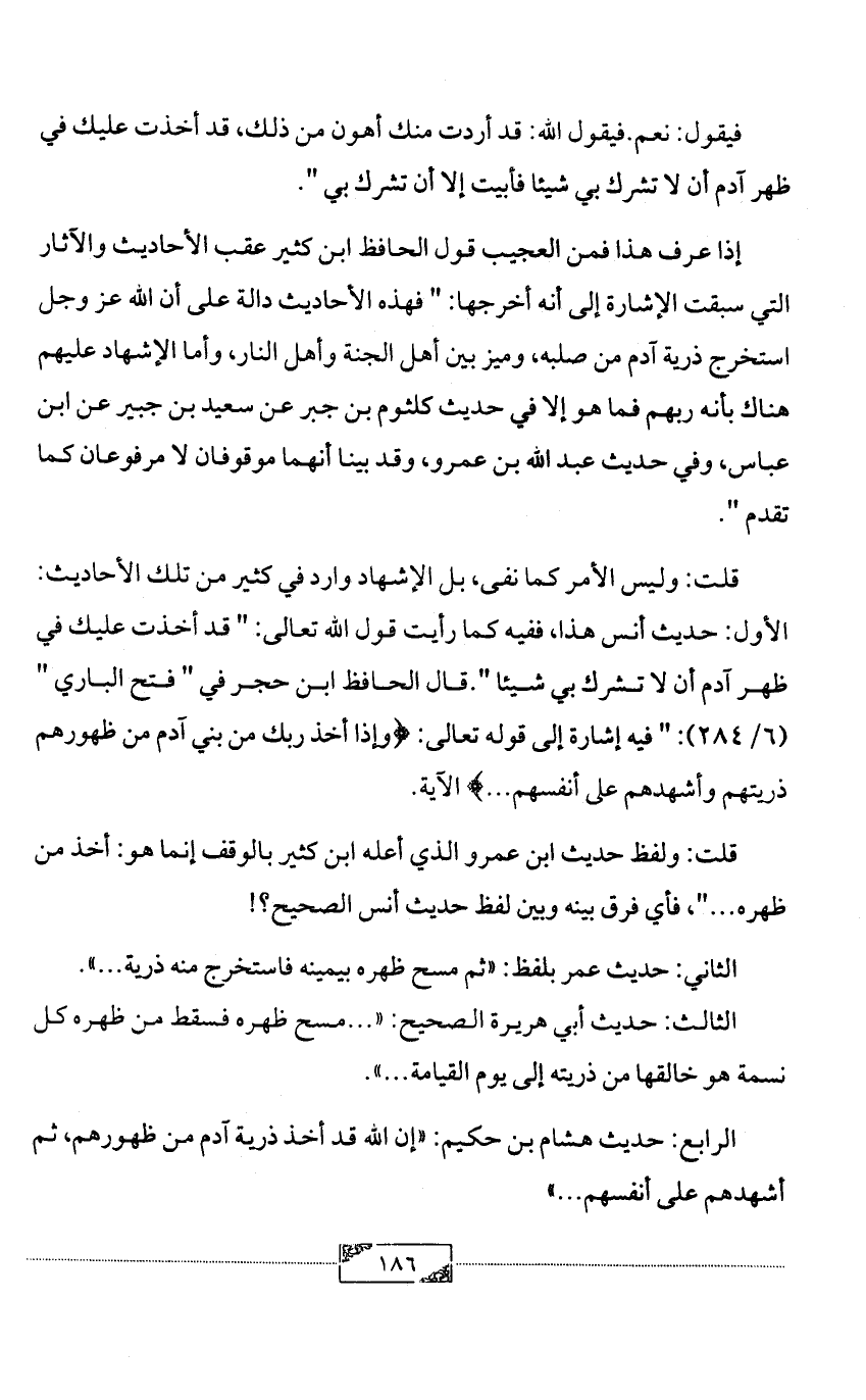 قلت: وليس الأمر كما نفى، بل الإشهاد وارد في كثير من تلك الأحاديث: الأول: حديث أنس هذا، ففيه كما رأيت قول الله تعالى: " قد أخذت عليك في ظهر آدم أن لا تشرك بي شيئا ".قال الحافظ ابن حجر في " فتح الباري " (6/ 284): " فيه إشارة إلى قوله تعالى: {وإذا أخذ ربك من بني آدم من ظهورهم ذريتهم وأشهدهم على أنفسهم ... } الآية.