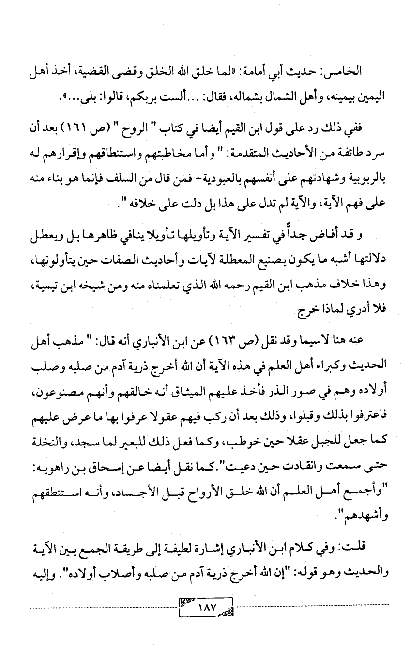 عنه هنا لاسيما وقد نقل (ص 163) عن ابن الأنباري أنه قال: " مذهب أهل الحديث وكبراء أهل العلم في هذه الآية أن الله أخرج ذرية آدم من صلبه وصلب أولاده وهم في صور الذر فأخذ عليهم الميثاق أنه خالقهم وأنهم مصنوعون، فاعترفوا بذلك وقبلوا، وذلك بعد أن ركب فيهم عقولا عرفوا بها ما عرض عليهم كما جعل للجبل عقلا حين خوطب، وكما فعل ذلك للبعير لما سجد، والنخلة حتى سمعت وانقادت حين دعيت".كما نقل أيضا عن إسحاق بن راهويه: "وأجمع أهل العلم أن الله خلق الأرواح قبل الأجساد، وأنه استنطقهم وأشهدهم".