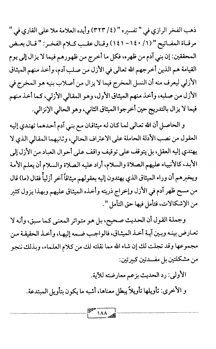 ذهب الفخر الرازي في " تفسيره " (4/ 323) وأيده العلامة ملا على القاري في " مرقاة المفاتيح " (1/ 140 - 141) وقال عقب كلام الفخر: " قال بعض المحققين: إن بني آدم من ظهره، فكل ما أخرج من ظهورهم فيما لا يزال إلى يوم القيامة هم الذين أخرجهم الله تعالى في الأزل من صلب آدم، وأخذ منهم الميثاق الأزلي ليعرف منه أن النسل المخرج فيما لا يزال من أصلاب بنيه هو المخرج في الأزل من صلبه، وأخذ منهم الميثاق الأول، وهو المقالي الأزلي، كما أخذ منهم فيما لا يزال بالتدريج حين أخرجوا الميثاق الثاني، وهو الحالي الإنزالي.