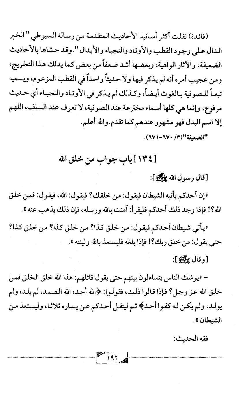 (فائدة) نقلت أكثر أسانيد الأحاديث المتقدمة من رسالة السيوطي " الخبر الدال على وجود القطب والأوتاد والنجباء والأبدال ".وقد حشاها بالأحاديث الضعيفة، والآثار الواهية، وبعضها أشد ضعفاً من بعض كما يدلك هذا التخريج، ومن عجيب أمره أنه لم يذكر فيها ولا حديثاً واحداً في القطب المزعوم، ويسميه تبعاً للصوفية بالغوث أيضاً، وكذلك لم يذكر في الأوتاد والنجباء أي حديث مرفوع، وإنما هي كلها أسماء مخترعة عند الصوفية، لا تعرف عند السلف، اللهم إلا اسم البدل فهو مشهور عندهم كما تقدم. والله أعلم.