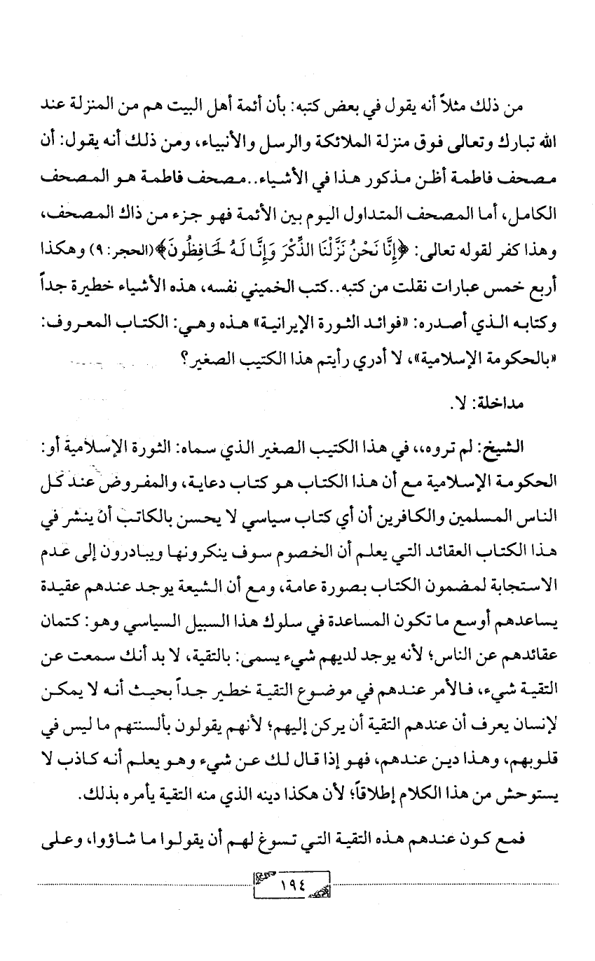من ذلك مثلاً أنه يقول في بعض كتبه: بأن أئمة أهل البيت هم من المنزلة عند الله تبارك وتعالى فوق منزلة الملائكة والرسل والأنبياء، ومن ذلك أنه يقول: أن مصحف فاطمة أظن مذكور هذا في الأشياء .. مصحف فاطمة هو المصحف الكامل، أما المصحف المتداول اليوم بين الأئمة فهو جزء من ذاك المصحف، وهذا كفر لقوله تعالى: {إِنَّا نَحْنُ نَزَّلْنَا الذِّكْرَ وَإِنَّا لَهُ لَحَافِظُونَ} (الحجر: 9) وهكذا أربع خمس عبارات نقلت من كتبه .. كتب الخميني نفسه، هذه الأشياء خطيرة جداً وكتابه الذي أصدره: «فوائد الثورة الإيرانية» هذه وهي: الكتاب المعروف: «بالحكومة الإسلامية»، لا أدري رأيتم هذا الكتيب الصغير؟