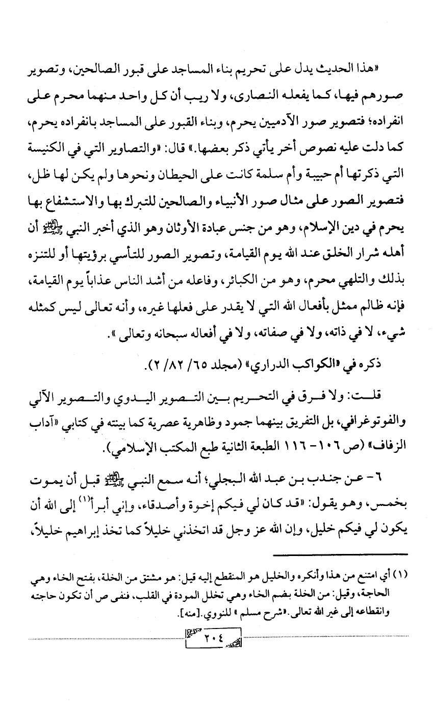 قلت: ولا فرق في التحريم بين التصوير اليدوي والتصوير الآلي والفوتوغرافي، بل التفريق بينهما جمود وظاهرية عصرية كما بينته في كتابي «آداب الزفاف» (- صلى الله عليه وسلم - 106 - 116 الطبعة الثانية طبع المكتب الإسلامي).