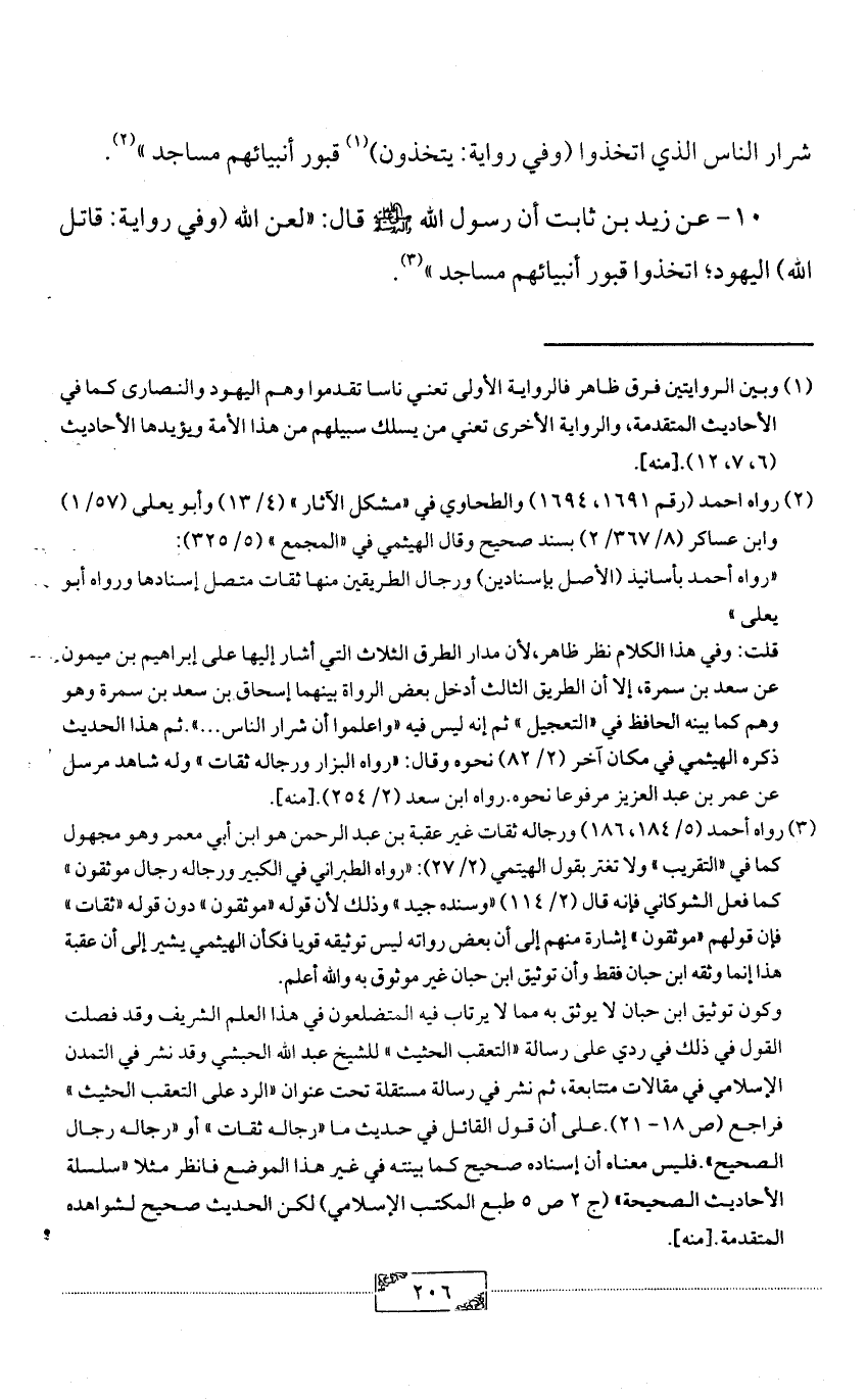 10 - عن زيد بن ثابت أن رسول الله - صلى الله عليه وآله وسلم - قال: «لعن الله (وفي رواية: قاتل الله) اليهود؛ اتخذوا قبور أنبيائهم مساجد» (¬3).